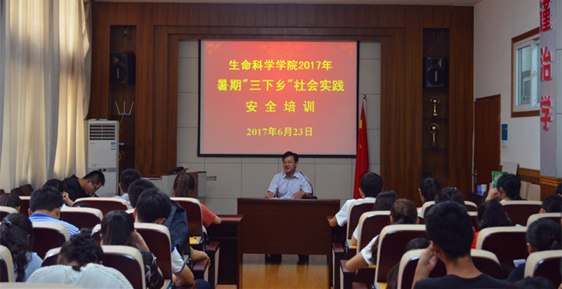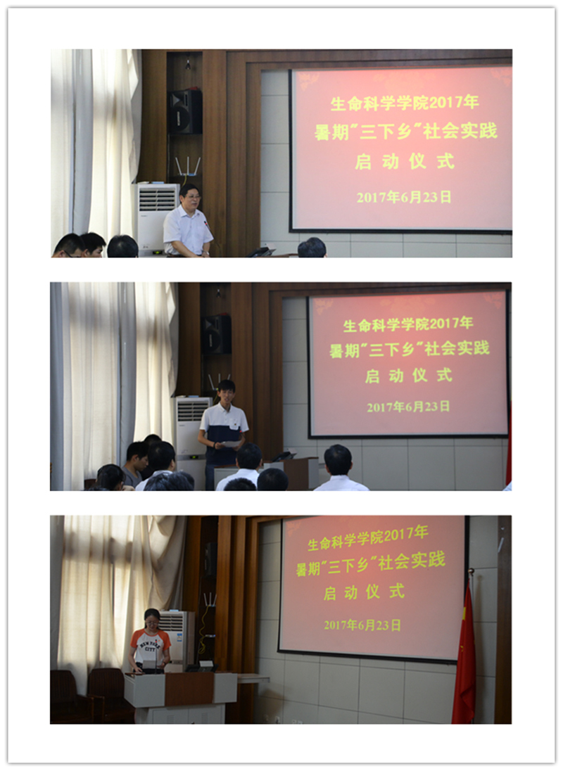 本网讯(生科院 王志)喜迎十九大,青春建新功。6月23日,我院暑期“三下乡”社会实践启动仪式隆重举行。校团委副书记汪凯、学院党委书记蒋学波、院长吴孝兵、党委副书记刘振杰、思政指导教师余在海、辅导员王志老师以及35支团队代表参加启动仪式。仪式由院团委书记赵喆老师主持。
