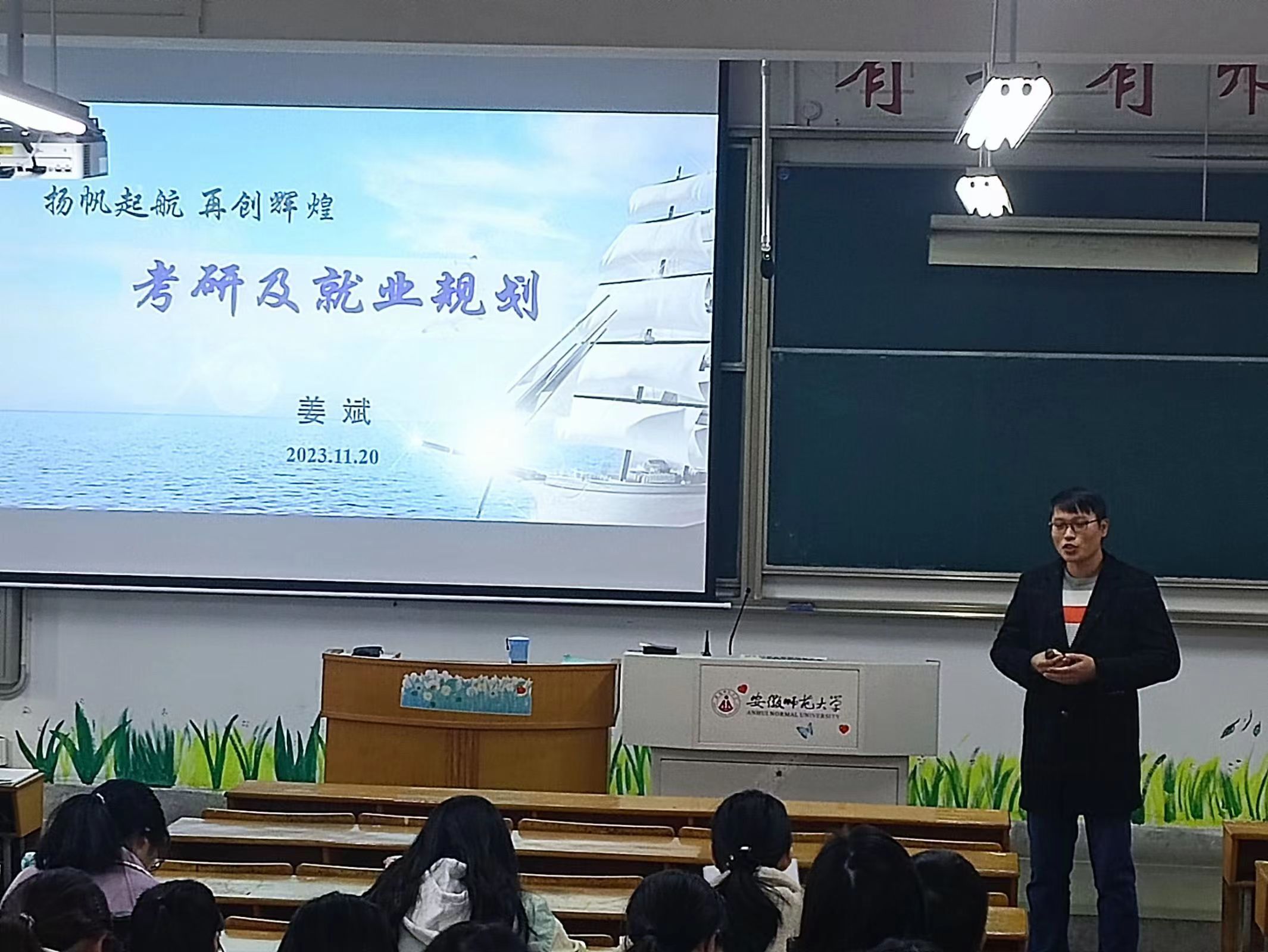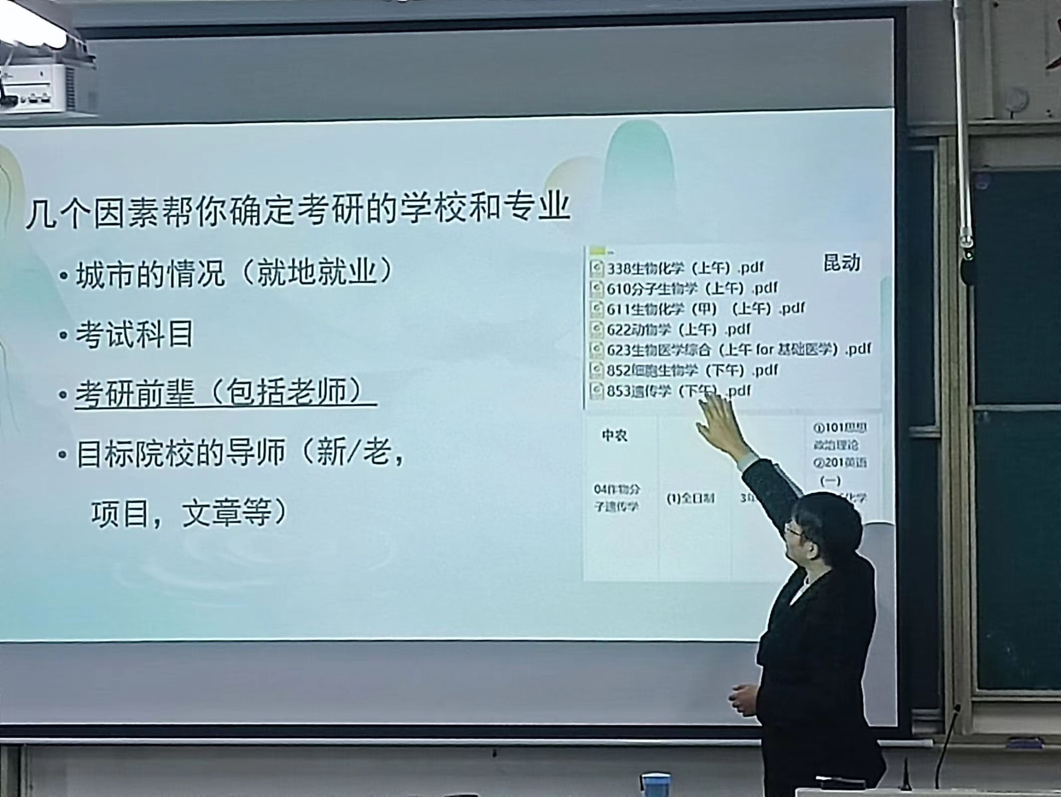 姜斌强调同学们要把握好人生道路的关键时刻,尽早确定人生大方向。他强调,立志科研、学历提升、直接工作等选择都要以兴趣为主,密切联系自身情况。姜斌围绕学院考研趋势、考研方向、考研院校选择等考研关键词与同学们分享了自己的想法。结合生科院往届毕业生的就业去向,为同学们分析了当前就业趋势和就业选择,明确了就业该做的准备,拓宽了同学们对本专业就业领域的认识。姜斌鼓励同学们围绕国家需求,将自身发展融入到国家发展中,坚持提升自己,立志做有利于社会的人才。