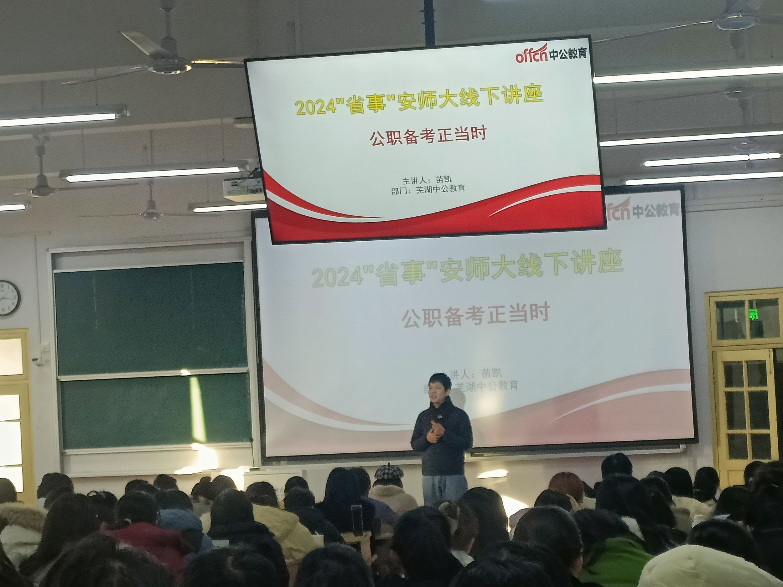 随后,苗凯为大家进行考公考编的指导。他分析了目前全国考公的形势,同时他帮助同学们区分了国考、省考、事业编、选调生和三支一扶的不同道路,并介绍了相关发展方向和可报岗位。接着,他详细地介绍了报考流程和公务员的薪资待遇。最后,他鼓励同学们明确目标、做好学业规划和备考安排。