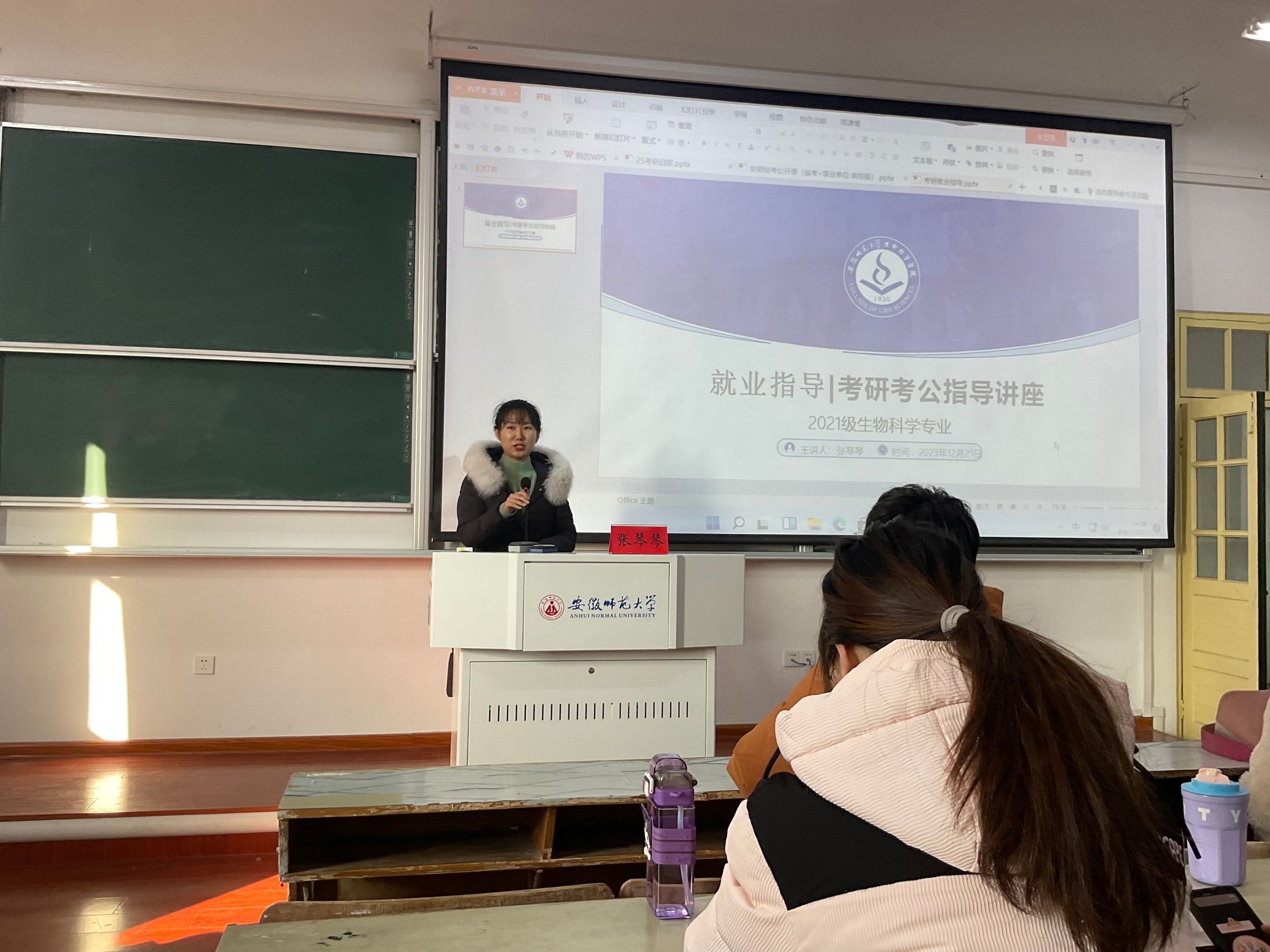 12月21日下午14时30分,21级生物科学专业于教学楼1401教室召开“考研考公就业”指导会。中公教育讲师张琴琴和苗凯受邀作为主讲嘉宾,辅导员周文娟讲座。