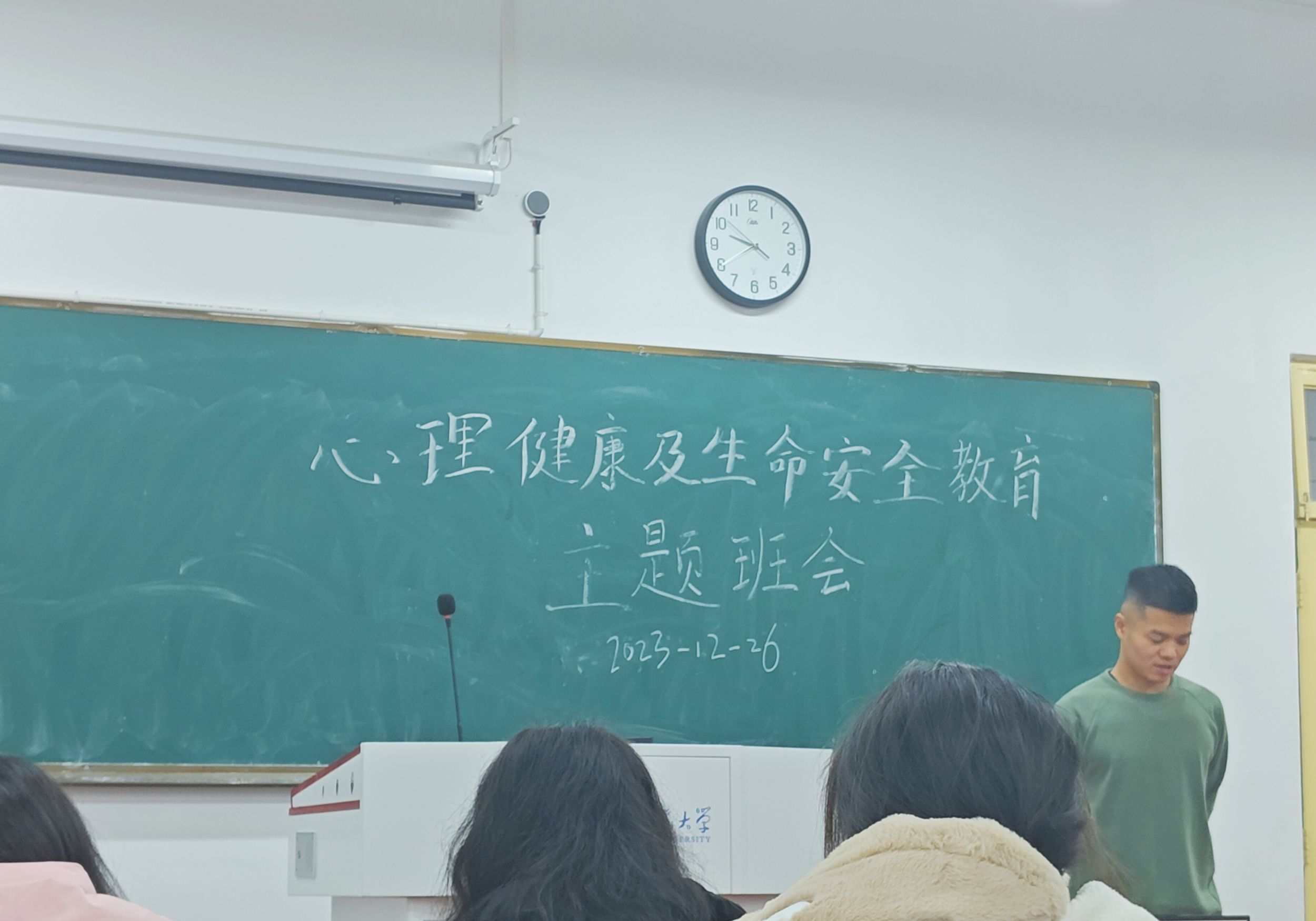 12月26日晚,2023级食品科学与工程专业于教学楼1313开展 “心理健康及生命安全教育”主题班会,班会由辅导员魏泽坤主持,班级全体同学参会。