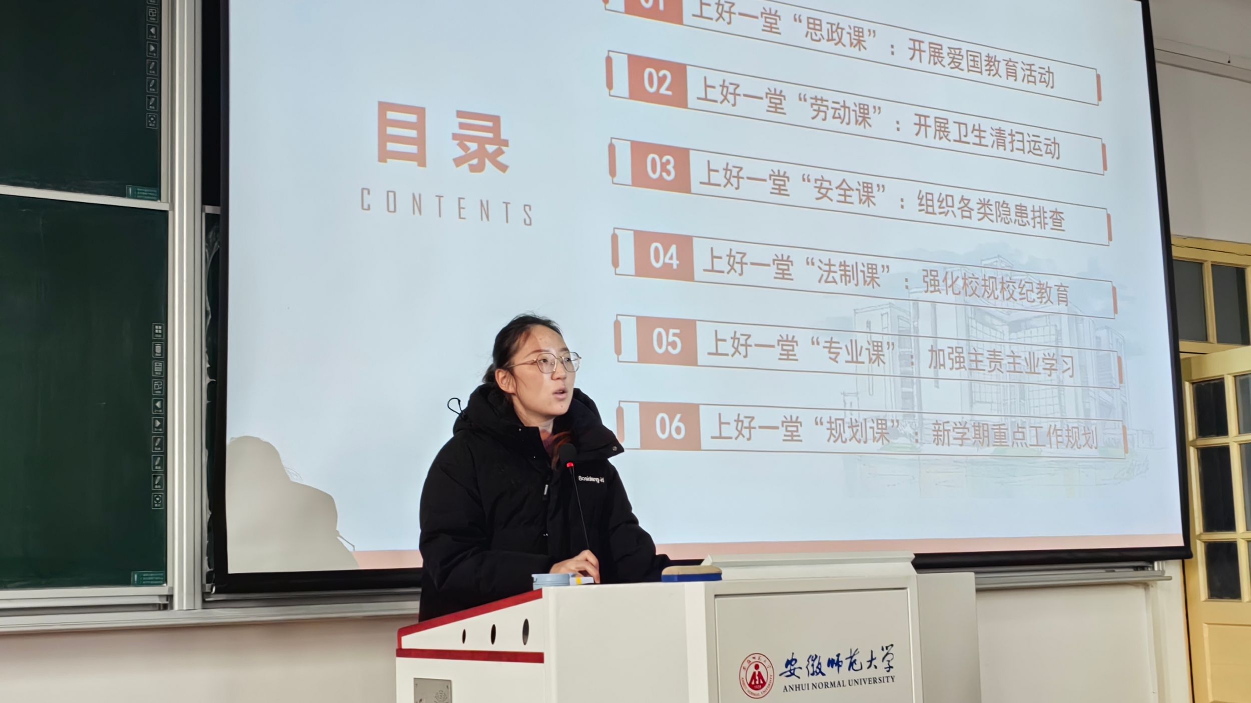胡玮老师将本学期各项重要安排及在校注意事项分为六个方面向同学们进行解读:上好一堂“思政课”,同学们观看抗美援朝短片,回顾历史,感恩先辈,新学期将持续开展爱国教育活动;上好一堂“劳动课”,各个班级需开展卫生清扫活动,促使学生养成良好卫生习惯和生活习惯;上好一堂“安全课”,加强在校学生的安全防范意识,保证自我人身安全、财产安全、心理安全,学院及老师对其重点进行安全隐患排查和安全提醒;上好一堂“法制课”,胡玮老师再次向学生明确请销假制度,强化校规校纪教育;上好一堂“专业课”,胡玮老师提醒全体同学及时完成学习任务,加强主责主业学习;上好一堂“规划课”,胡玮老师对新学期重点工作进行梳理、总结、规划。
