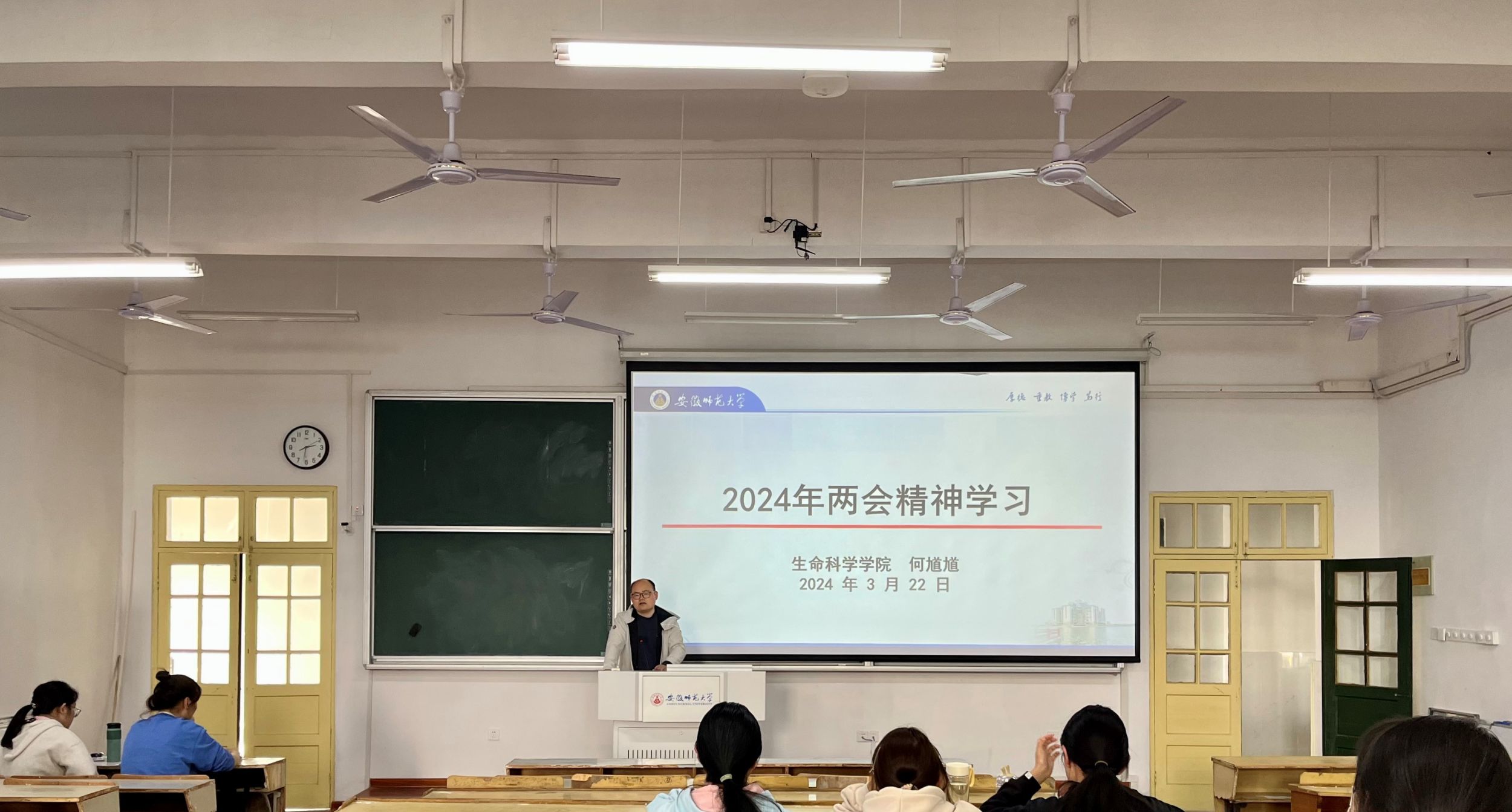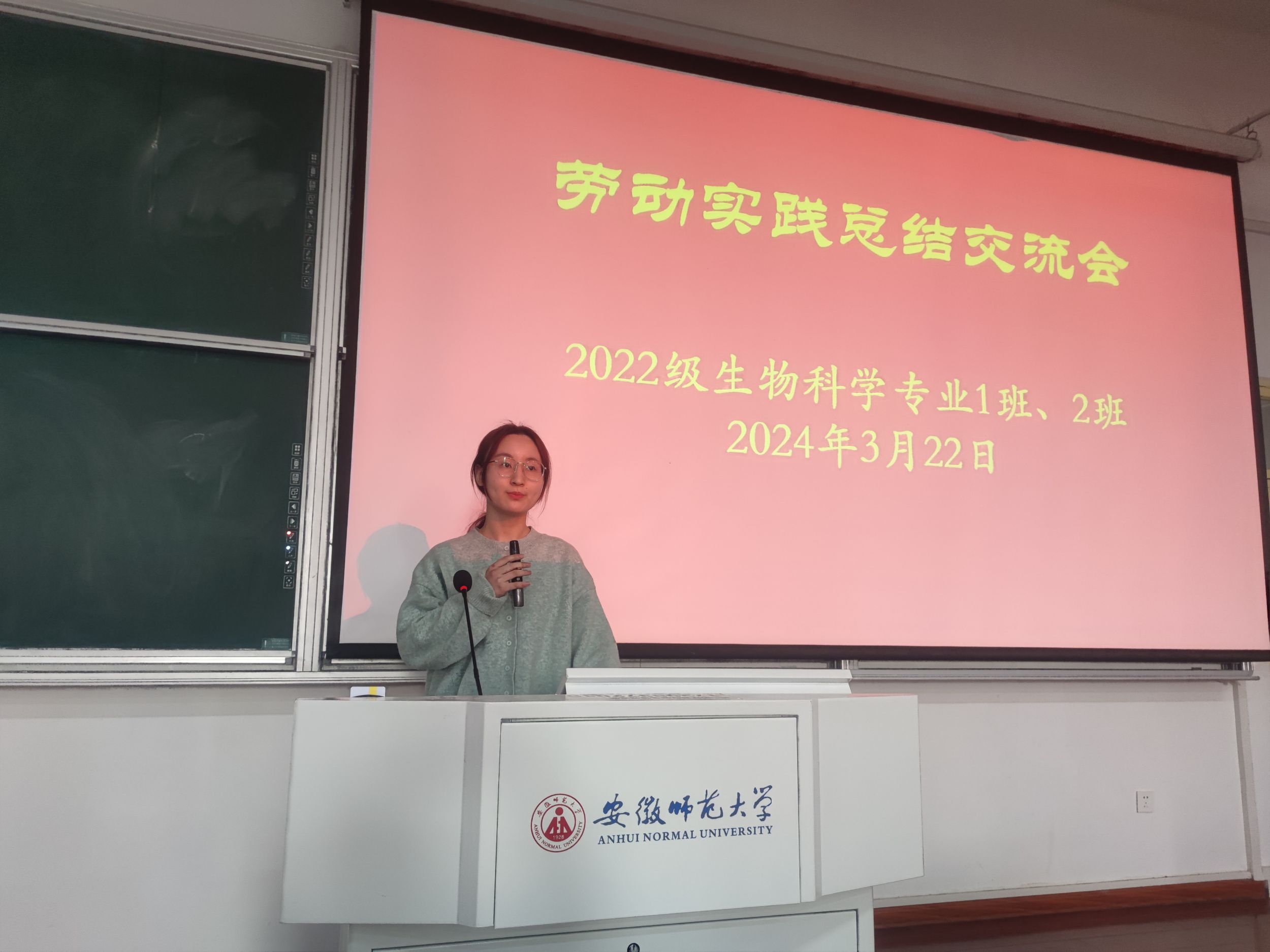 3月22日下午,2022级生物科学专业1班、2班在教学楼1403教室召开2024年全国两会精神学习会暨劳动实践总结交流会。会议由辅导员何馗馗主持主讲。
