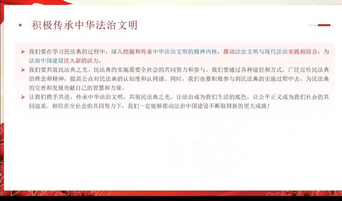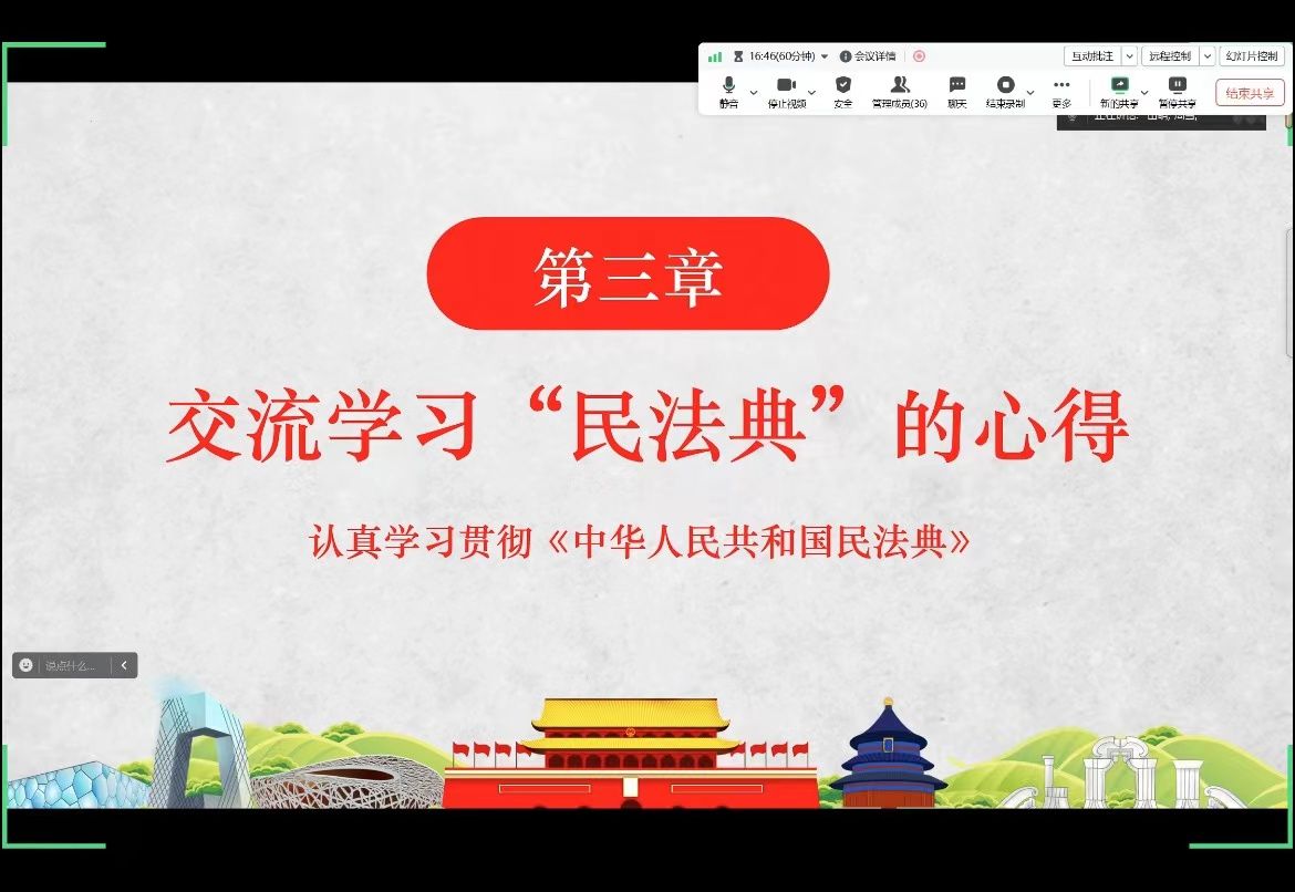 为深入学习贯彻习近平法治思想,增强大学生的法治意识,2021级生物科学专业在实习之余,通过线上渠道召开《民法典》学习班会。此次班会通过个人领学、小组讨论、案例分析等方式,旨在让大学生们更加全面、深入地了解《中华人民共和国民法典》,不仅为同学们提供了一个学习法律知识的平台,也为大家营造了一个尊法学法守法用法的良好氛围。