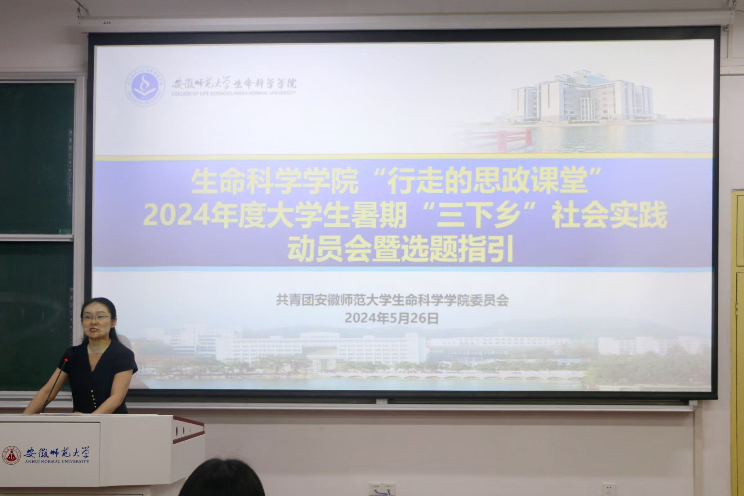 为学习贯彻党的二十大精神和习近平总书记五四重要寄语精神,进一步落实大学生护航行动计划,深化“行走的思政课堂”实践育人项目内涵提升,把思政小课堂和社会大课堂结合起来。5月26日晚,76net必赢线路检测中心于教学楼1401举行“行走的思政课堂”2024年大学生暑期“三下乡”社会实践动员会暨选题指引。学院党委副书记汪倩倩、团委书记刘梦婷、2022级生物技术专业辅导员汪建中出席本次会议,2022级生物技术专业全体同学、2022级生物科学专业及2023级各专业班长、团支书、宣传委员、组织委员和素质拓展委员参加会议。会议由学院团委副书记王倩主持。