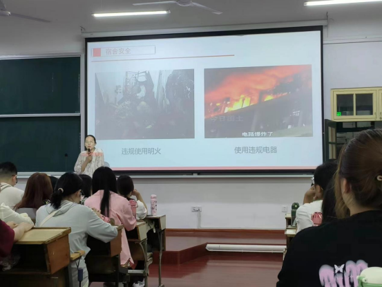 胡玮老师从国家安全、消防安全、宿舍安全、食品安全、交通安全、财产安全、实验室安全、防溺水安全、网络安全九个方面入手,细致全面地罗列生活中存在的安全隐患。她深入学生日常学习生活,提醒学生:离开宿舍及时上锁,不轻信陌生人;校外出行乘坐正规交通工具;宿舍严禁使用明火,严禁使用违规电器;进行实验需穿着实验服,遵守实验室要求,注意个人卫生等。同时,胡玮老师注重国家安全教育,带领学生了解国际形势,加强国家安全意识。