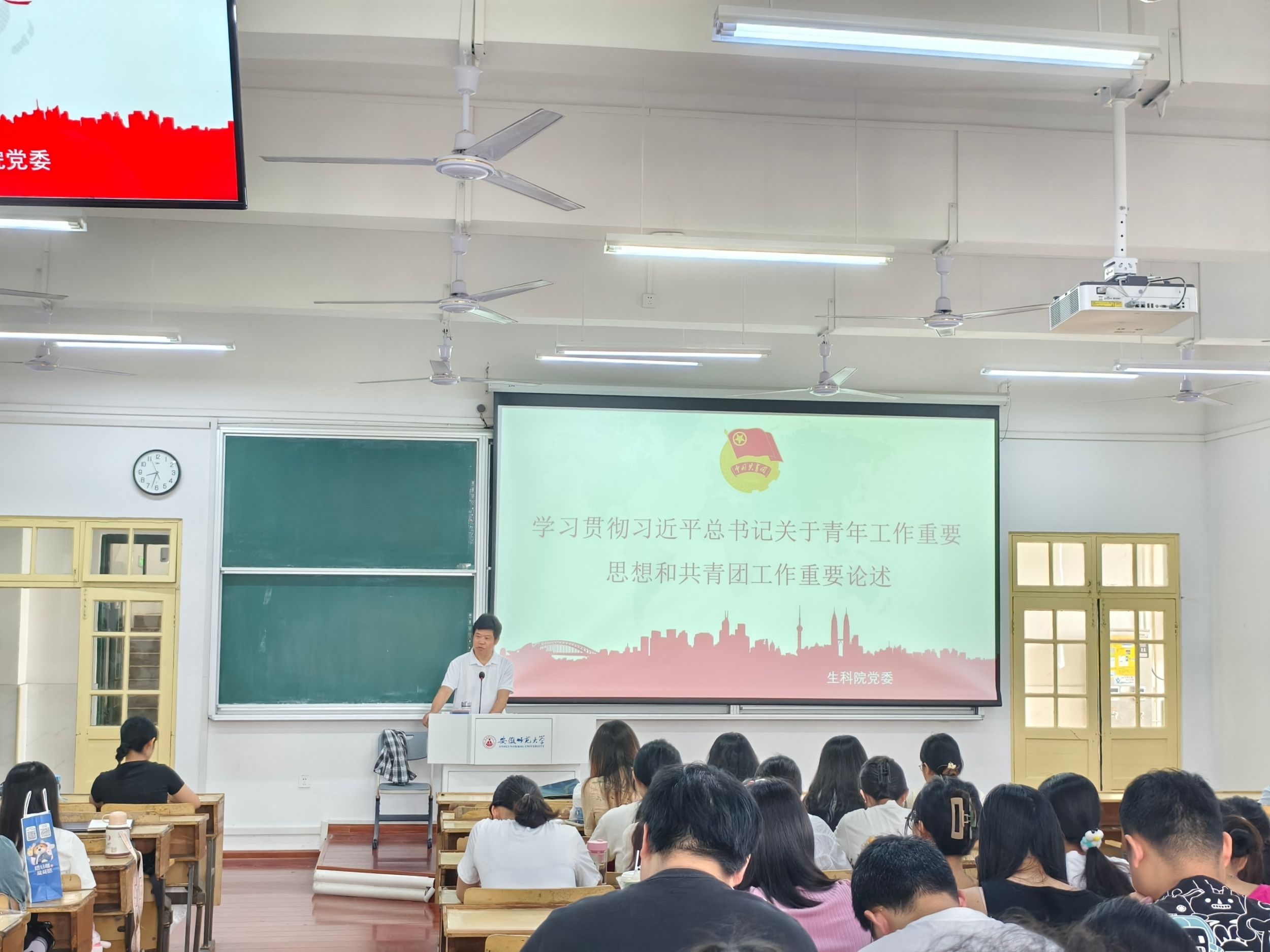 6月13日上午,76net必赢线路检测中心党委书记蒋学波为2021级生物科学(师范)专业学生讲授题为“学习贯彻习近平总书记关于青年工作重要思想和共青团工作重要论述”思政课,会议由辅导员周文娟主持,21级生物科学专业2班、3班全体同学参加。