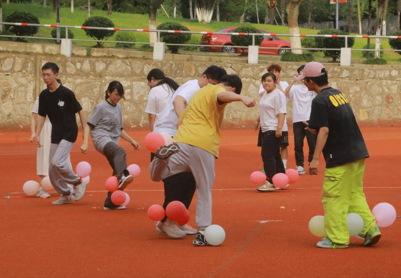阻力绳拉力赛上,参赛者两两一组,通过一条阻力绳相互连接,用尽全力往相反方向拉动,敲响胜利的鼓声。现场欢呼声、加油声此起彼伏,展现了选手们的拼搏精神和团队协作能力;疯狂三步棋则考验了参赛者的智力与策略,棋盘前围满了观众,大家屏息凝神,关注着每一个巧妙的走步;背对背夹球比赛则是另一番景象,参与者背靠背,夹着球走向终点,既考验了协调性,又考验了平衡感,引得观众发出阵阵笑声;气球踩踩踩环节更是将气氛推向高潮,参赛者脚踩气球尽可能不让它爆炸,而对手则要尽力将对方的气球踩爆,既紧张刺激又欢乐无比。