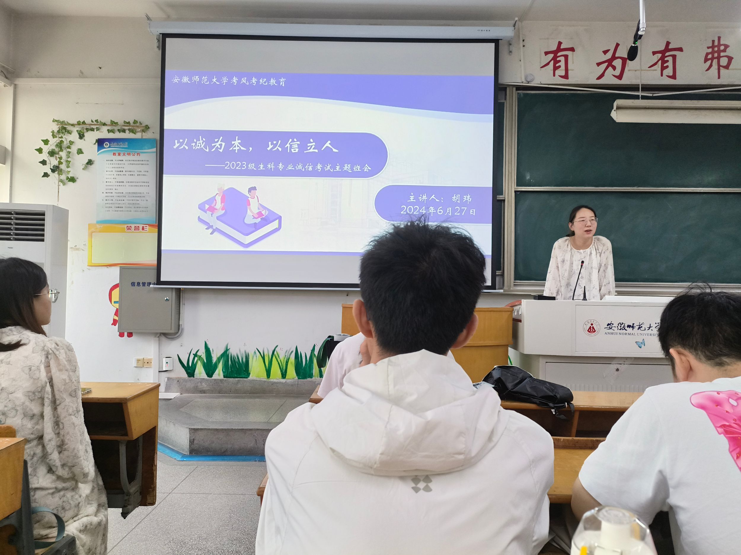 6月27日,2023级生物科学专业开展诚信考试教育主题班会。2023级生科专业全体同学参会,会议由辅导员胡玮老师主持。