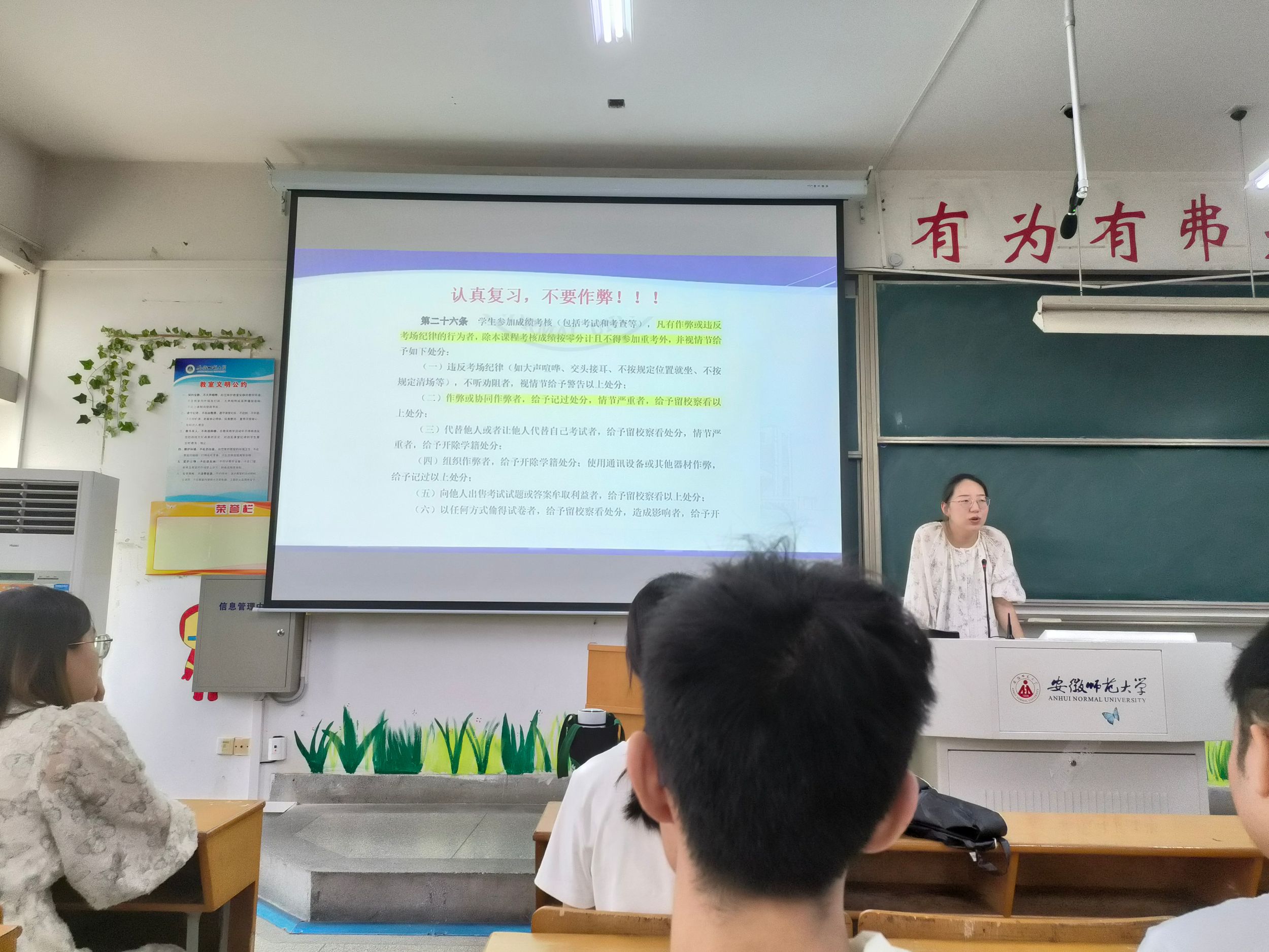 期末考试在即,胡玮老师公布各科考试的时间安排以及放假时间安排,提醒同学们合理分配时间,认真复习。胡玮老师就考场纪律介绍学校关于考试的各项规定,强调学生严格遵守考试守则,诚信考试,杜绝一切作弊行为。她罗列出期末考试周的注意事项,鼓励同学们把握时机,调整心态,有疑问及时请教老师,希望同学们积极备考、诚信考试、考出能力、考出水平。