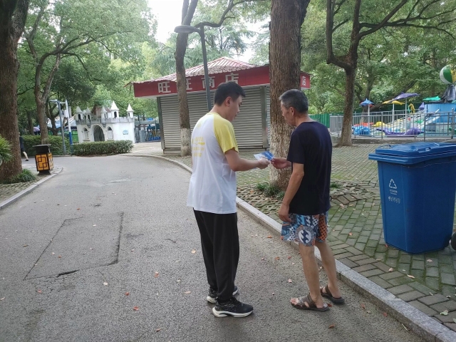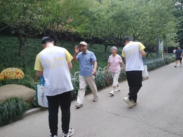 经过学习,团队成员出发前往赭山公园开展防艾遏核宣传活动。团队成员首先询问了几位在公园散步的老人和青年,就他们对艾滋病和肺结核的了解程度进行了简单交流,以方便对后续的宣传面对人群和内容上的侧重点进行适当的调整。