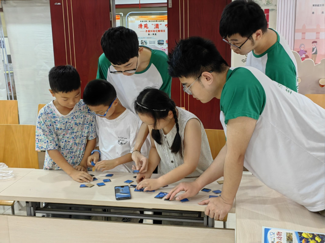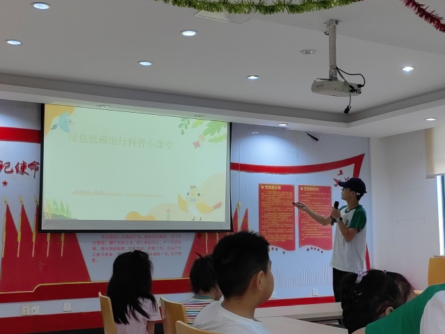 今天的活动主题是低碳出行。活动伊始,主讲人于涛和郑凯询问孩子们是否知晓低碳出行的含义。从孩子们七嘴八舌的回答来看,他们对低碳出行的意义及其与环保的关系有一定了解,但在具体内容上仍有一些认知模糊的地方。两位主讲人紧接着讲述了低碳出行的具体内涵、方式和重要性,向小朋友们传播节能减排的概念和它对于我们所提倡的绿色生活的影响。在完成理论知识的内容讲解过后,于涛和郑凯通过提问的方式加深小朋友们对这堂低碳出行主题课的印象。最后,实践队员们让小朋友们用拼图拼几类交通工具,让他们分辨哪些交通工具属于低碳排放的交通,并鼓励小朋友们在日常生活中选择更环保的出行方式。