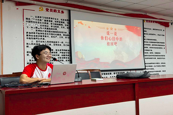 绘画课堂上,志愿者们首先询问孩子们关于祖国的了解,以此作为引入点,激发孩子们的思考和兴趣。一根时间轴,串联起党发展的历程,志愿者为孩子们介绍了新中国成立之前发生的几件里程碑式事件。志愿者们向孩子们讲解了一些党与国家相关的背景知识,如国旗、国歌、国徽等,帮助孩子更好地理解和表达爱国情感。这些知识的讲解,也为他们后续的创作提供了丰富的素材和思路。志愿者魏岩祎还进行了示范教学,向大家展示如何绘画天安门广场标志性建筑。