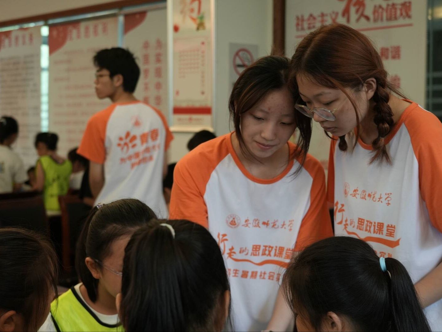活动尚未正式开始,社区活动中心内已是一片欢声笑语。小朋友们穿着色彩斑斓的衣服,脸上洋溢着期待与好奇的笑容,在家长的陪伴下陆续抵达。助教团队成员们身着统一的橙色队服,以温暖的笑容迎接每一位小朋友的到来。签到区,小朋友们兴奋地排着队,在助教的帮助下完成了签到,并穿上老师们分发的活动马甲依次入座。
