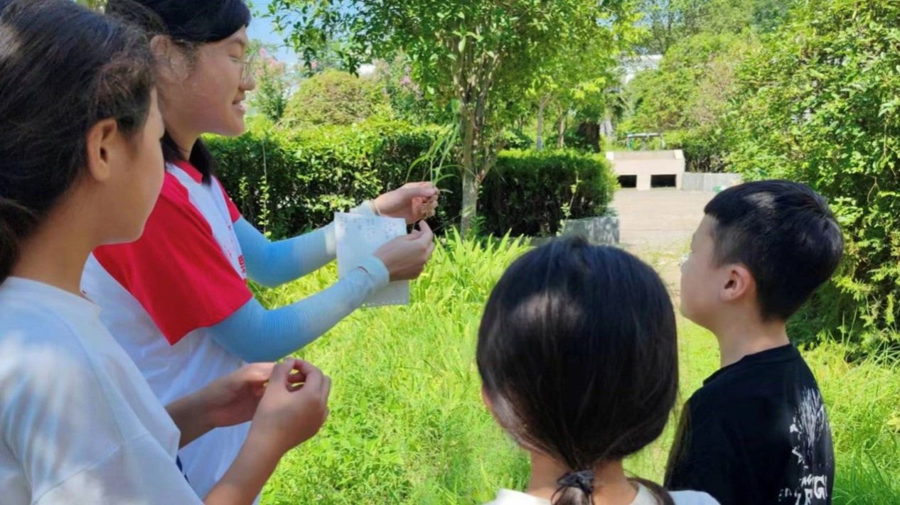 团队成员将学习材料生活化,加强“书本世界”与学生“生活世界”的沟通,将学生分成小组进行校园植物认知,不仅能够将知识准确传授给学生,而且能够观察到每个学生对于植物认知的不同反应。团队成员充分利用自身专业优势,从植物的花、果实、叶等突出特征教学,引导学生自我思考,努力满足孩子们的好奇心,在学习的过程中,同学们也积极配合,互相询问着喜欢的植物,主动提出问题。同时,团队成员将自然与生活结合,在科普知识的同时让同学们感受到大自然之美,由此引出大自然的脆弱,让同学们知道从点滴做起,从日常生活注意保护大自然。