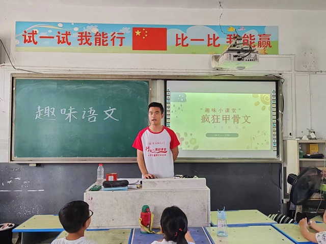 本网讯(生科院 李佳鑫)为了激发学生学习语文的兴趣,拓宽其知识视野,2024年7月31日,生科院“优师计划”赴亳州双庙中心学校爱心支教本科生社会实践团队在双庙第二小学进行趣味语文课堂——疯狂甲骨文。