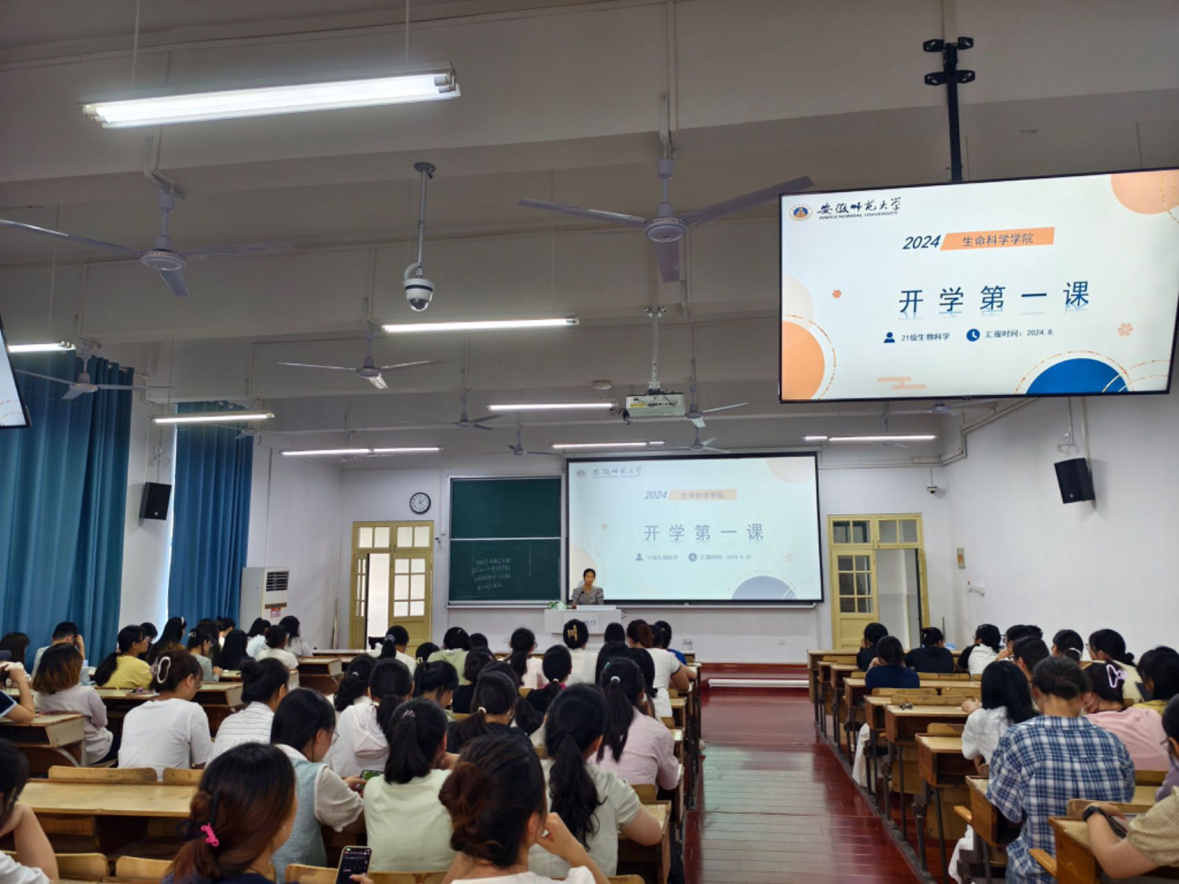 8月28日下午,2021级生物科学专业于教学楼1401召开“开学第一课”主题班会。会议由辅导员周文娟主讲,21级生物科学专业全体同学以线上线下相结合的方式参加会议。
