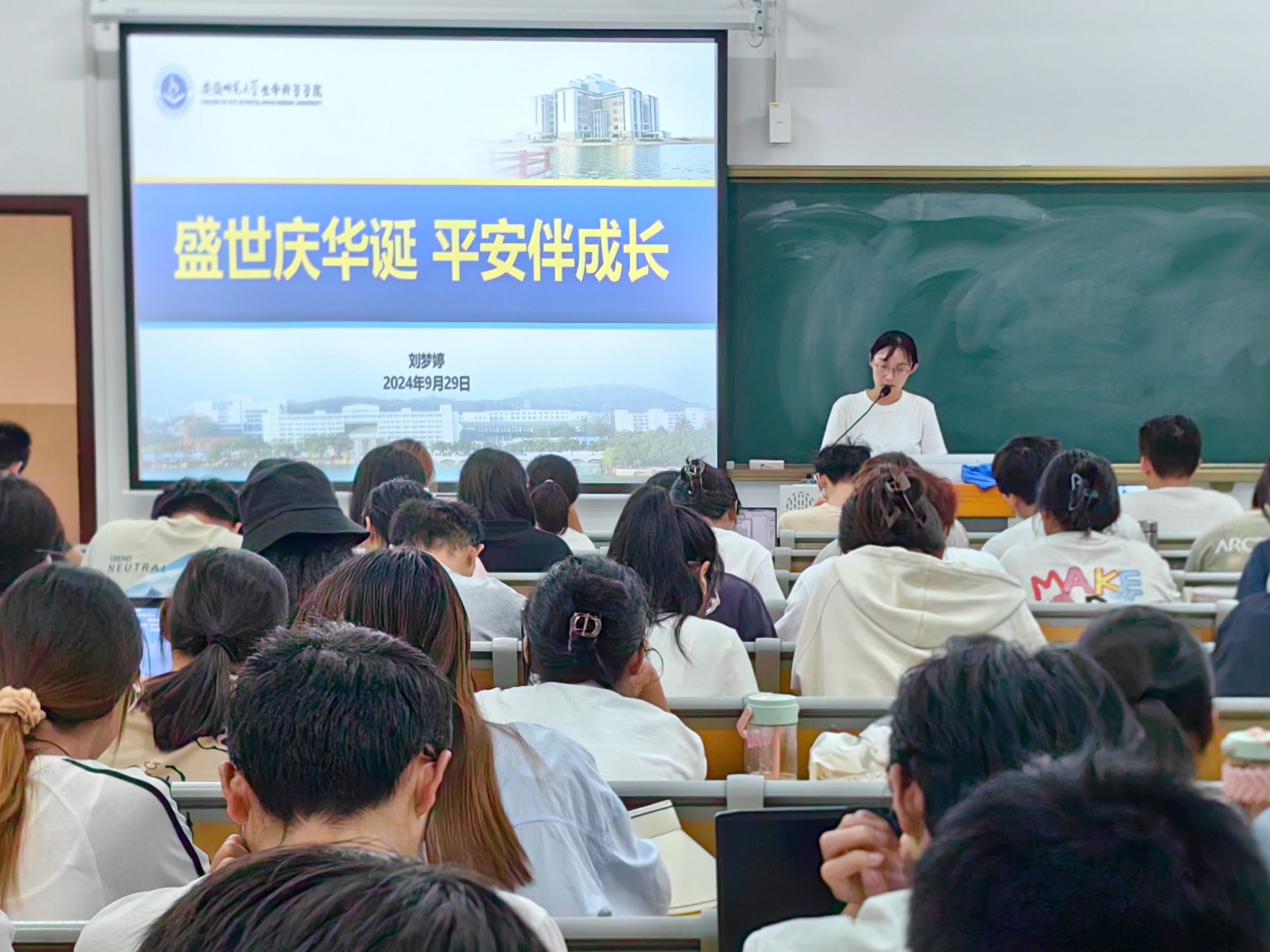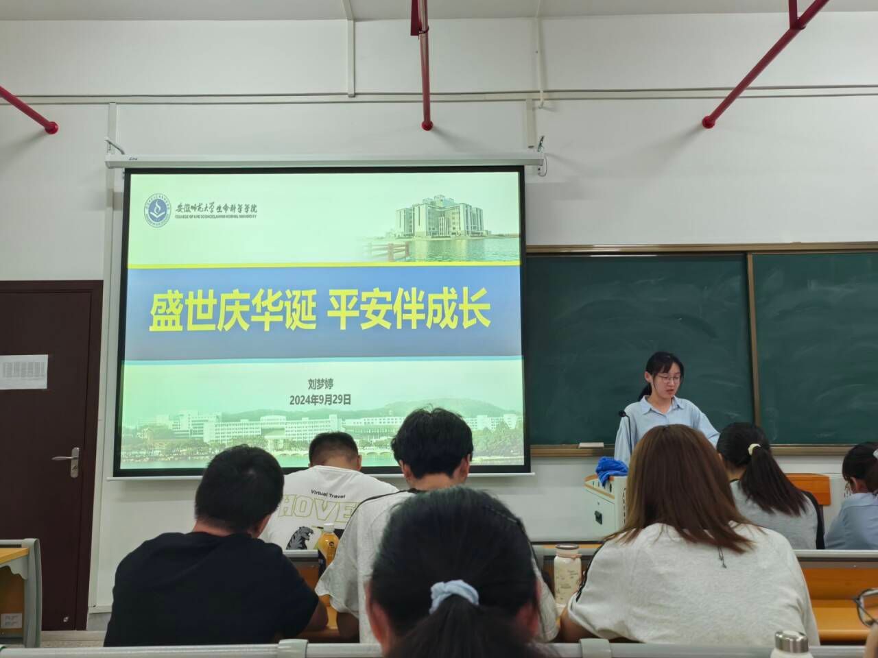 9月29日,2023级生物科学、生物技术专业开展“盛世迎华诞 平安伴成长”主题班会,班会由辅导员刘梦婷主讲。