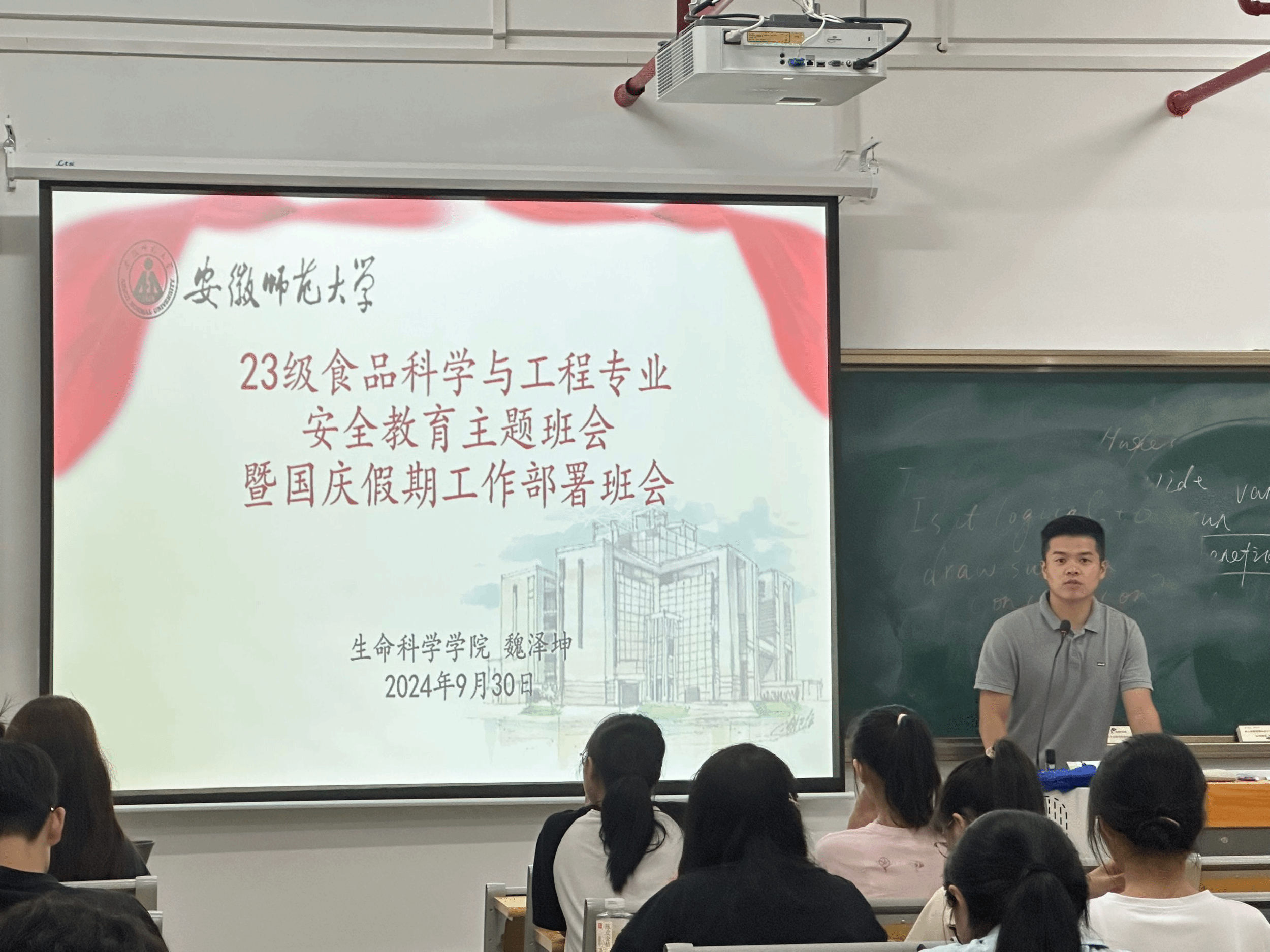 9月30日上午,2023级食品科学与工程专业1班在清源楼C208开展安全教育主题班会暨国庆假期工作部署班会。本次班会由辅导员魏泽坤主持,食科1班全体同学参加。