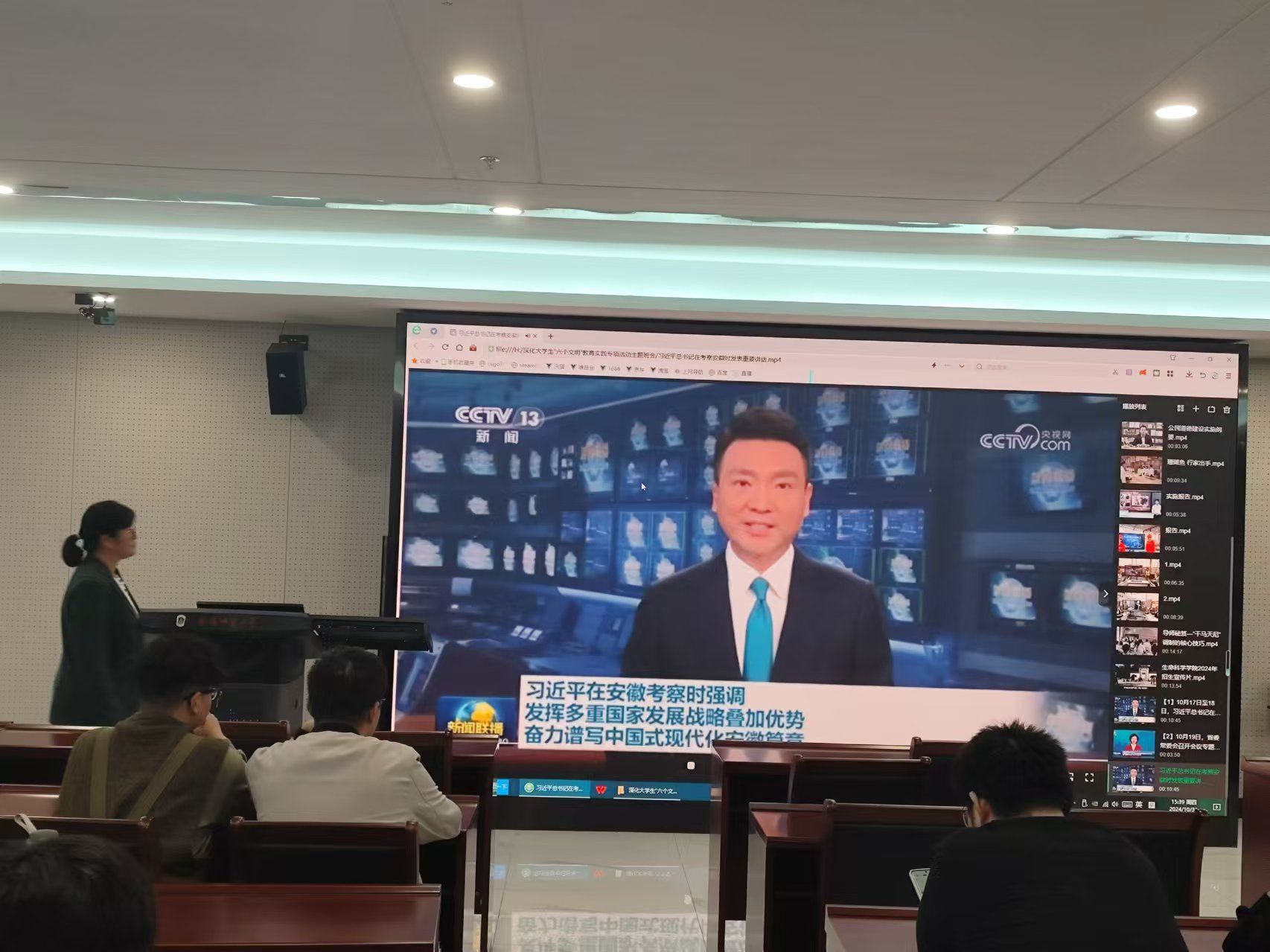 柴文杰首先带领同学们观看习近平总书记考察安徽的新闻报道,学习习近平总书记重要讲话精神,引导同学们发挥中华民族讲求礼让、以和为贵的传统美德传承优秀中华传统文化,弘扬社会主义核心价值观。鼓励同学们作为研究生要带头维护文明的校园环境,倡导良好社会风气,就像习近平总书记强调的那样,要始终保持积极的人生态度、良好的道德品质和健康的生活情趣。