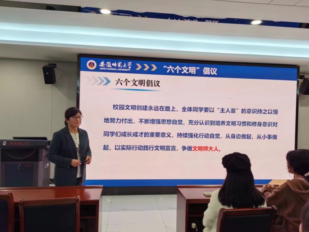 接下来,柴文杰通过具体的案例,从正反两个角度详细介绍了文明教室、文明宿舍、文明就餐、文明交通、文明交往、文明上网这六个方面的文明创建活动,要求同学们自觉维护正常课堂秩序、保持良好宿舍卫生、培养文明就餐习惯、牢记文明交通出行、树立交往文明礼仪、养成文明上网习惯。