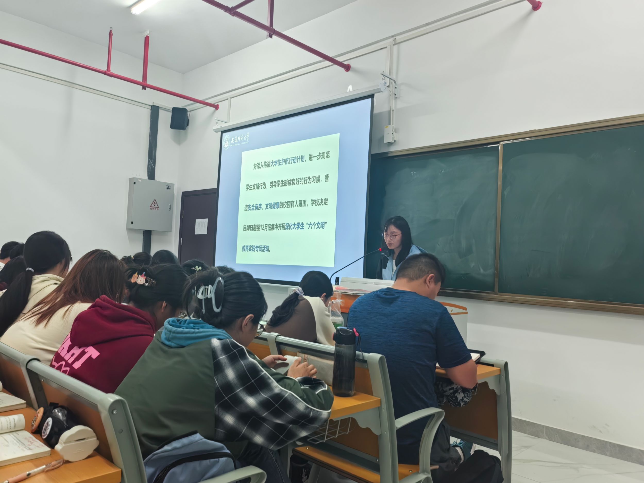 刘梦婷就学校关于深化大学生“六个文明”教育实践的专项活动方案对创建文明校园进行了介绍,通知学校将集中开展“六个文明”教育实践专项活动,包括文明教室、文明宿舍、文明就餐、文明交通、文明交往、文明上网六个方面。她强调学生应严格遵守校规校纪,加强思想道德修养,拥有健康的生活情趣,积极践行“六个文明”准则,共同营造安全有序、文明健康的校园氛围。