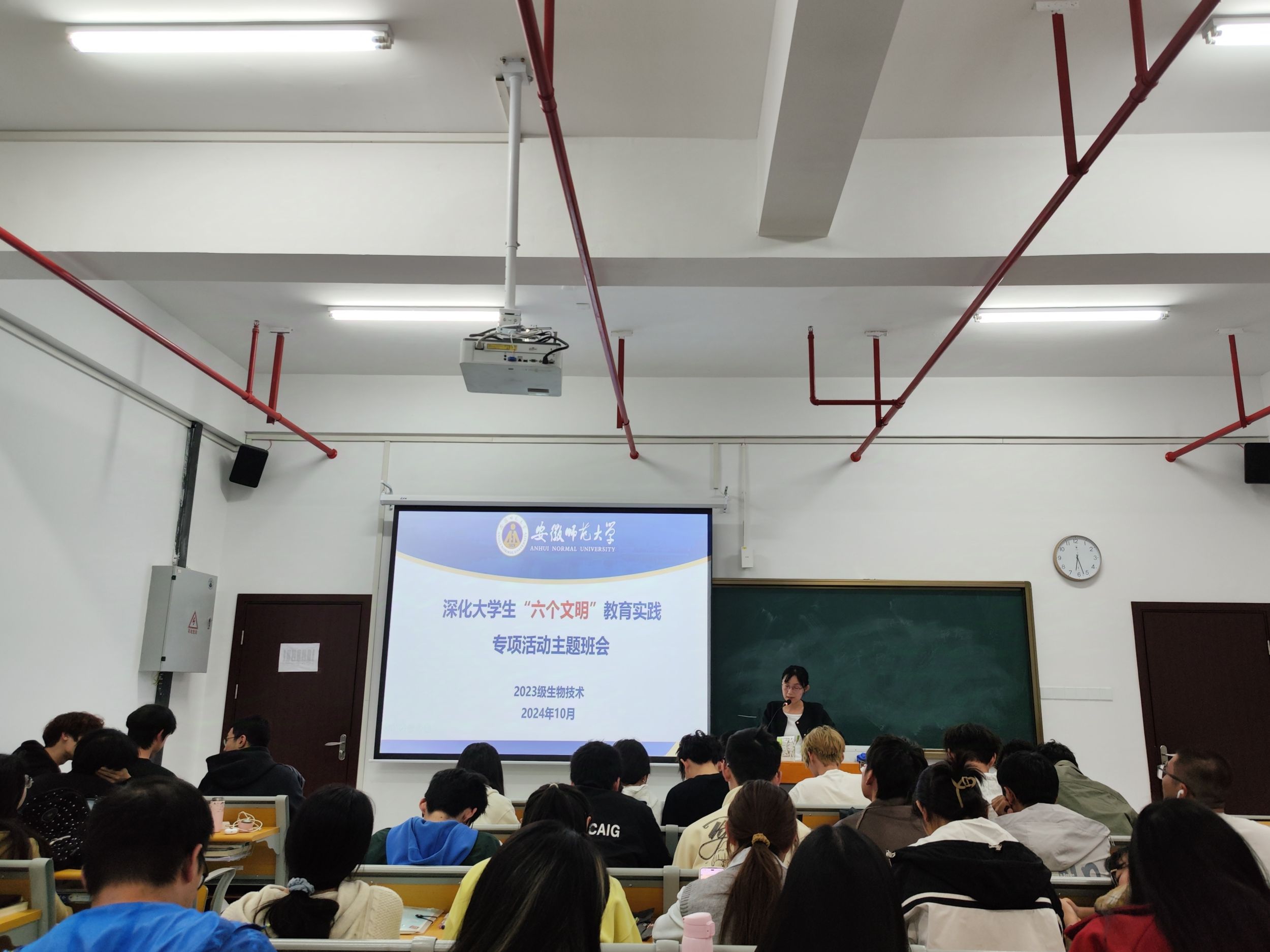 10月31日、11月1日,2023级生物科学卓越教师班、1班、2023级生物技术专业召开深化大学生“六个文明”教育实践专项活动主题班会。2023级生物科学卓越教师班、1班、2023级生物技术专业全体同学参会,会议由辅导员刘梦婷主持。