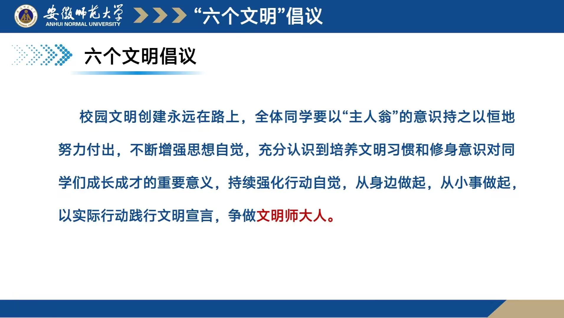 周文娟围绕文明教室、文明宿舍、文明就餐、文明交通、文明交往、文明上网具体内容展开,希望同学们能够从身边做起,从小事做起,以实际行动践行文明宣言,争做文明师大人。