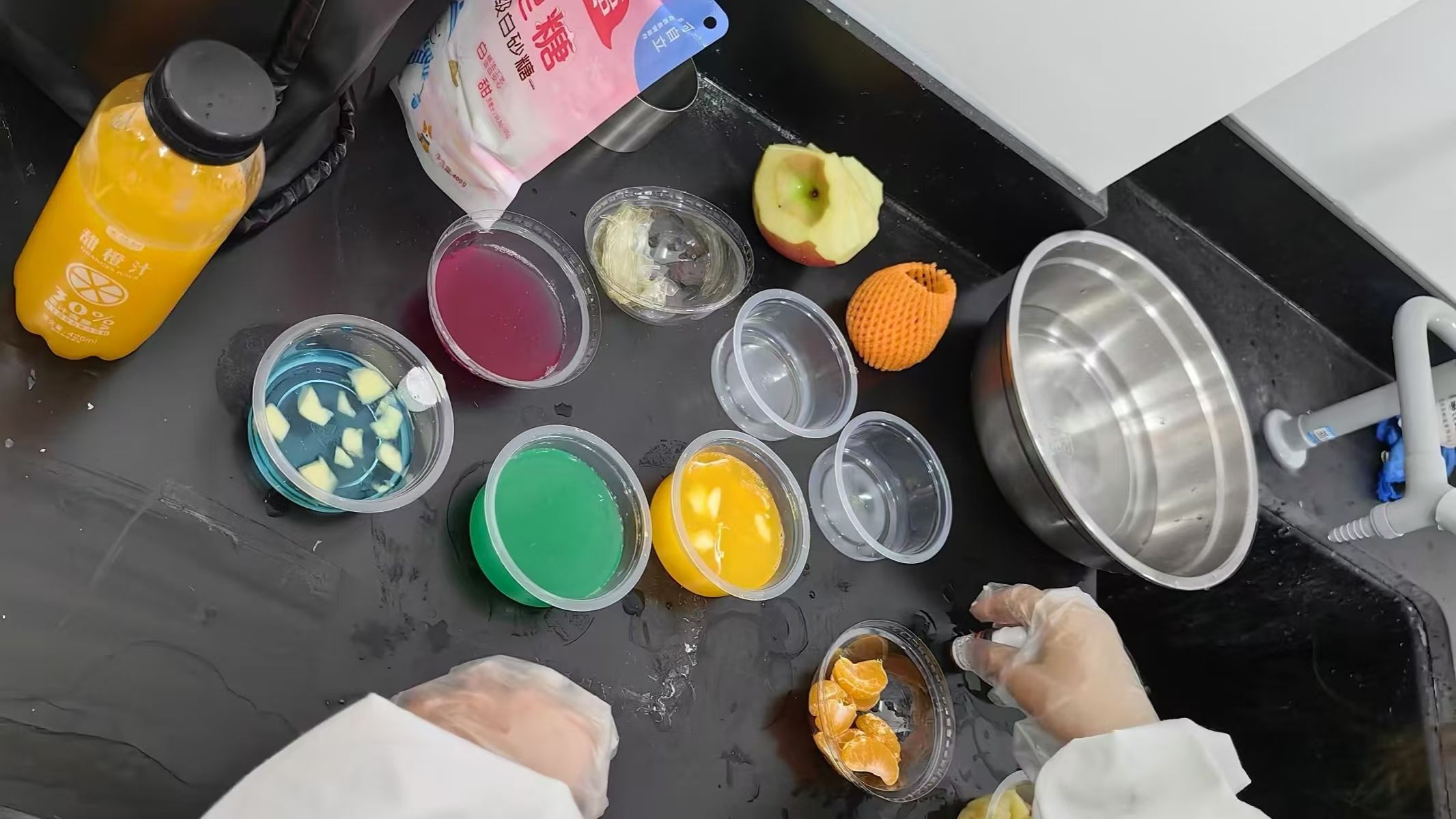 活动现场,色彩斑斓的果冻原料摆放整齐,散发着诱人的果香。参赛者们热情高涨,纷纷化身“果冻艺术家”,他们凭借着天马行空的想象力和精湛的动手能力,将果冻原料精心搭配组合。在制作过程中,大家或是专注于调配独特的果汁比例,或是精心雕琢果冻的造型,力求让自己的作品脱颖而出。整个制作过程充满了欢声笑语,同学们纷纷拿出手机记录下这美好的时刻。