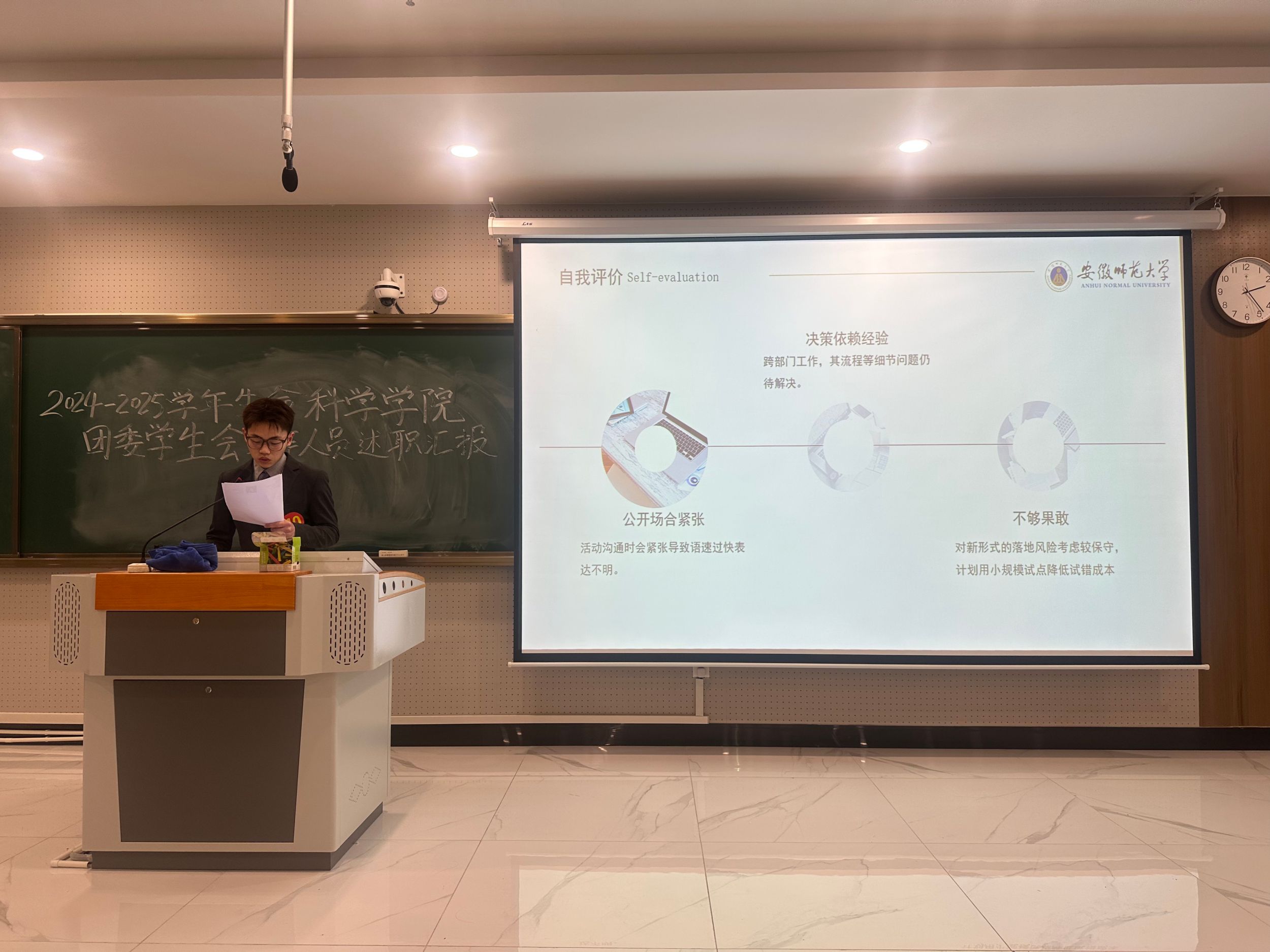 学生会及团委各部门负责人依次述职,通过PPT展示,从组织建设、活动开展、部门特色工作等方面总结工作成果,重点介绍部门成员的专业技能提升和成长情况。此外,述职人员还深入剖析了工作中存在的“活动创新不足”“部门协作效率有待提高”等问题,并提出相应的改进措施,为下一步工作明确了方向。