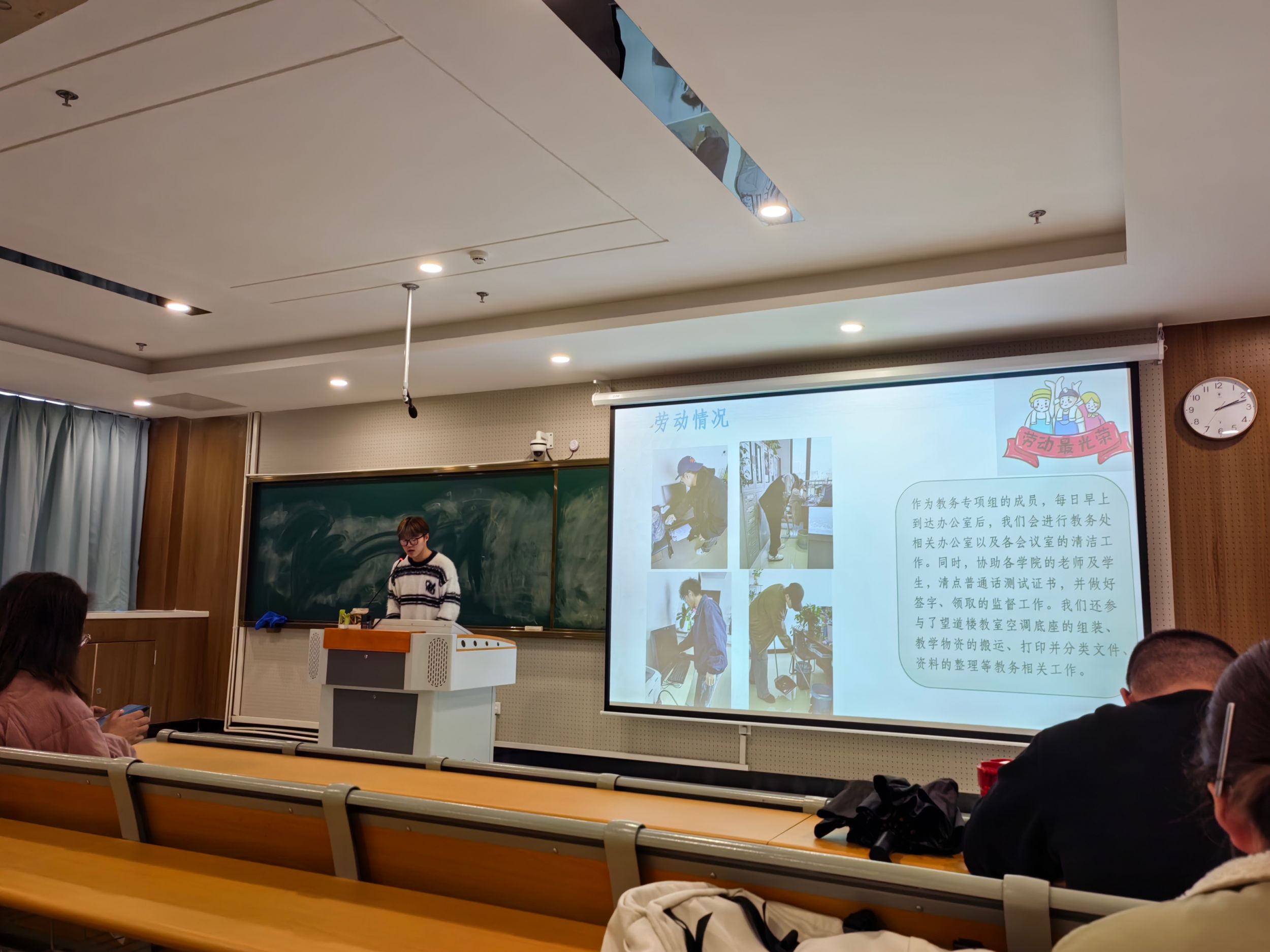 在劳动周期间,本专业学生分为多个劳动小组,围绕能源、维修、安保、餐饮、绿化、保洁六个方面开展实践,在不同岗位上体验多样的劳动内容。各劳动组组长纷纷上台分享这一周的实践成果与感悟。