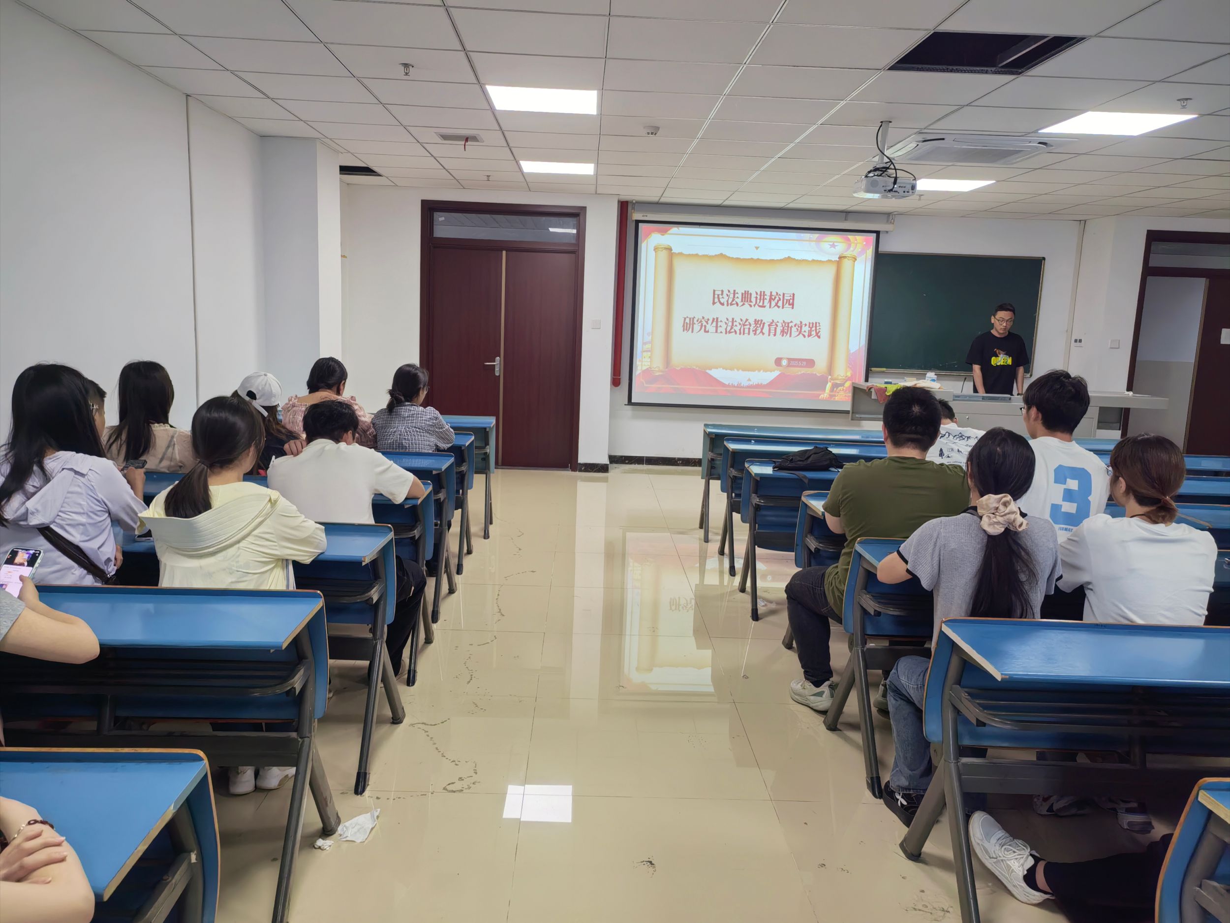 为强化研究生法治意识,建设遵纪守法、文明和谐的校园环境,5月28 日,2024 级研究生在文典楼E406教室组织开展了“民法典进校园”主题班会。