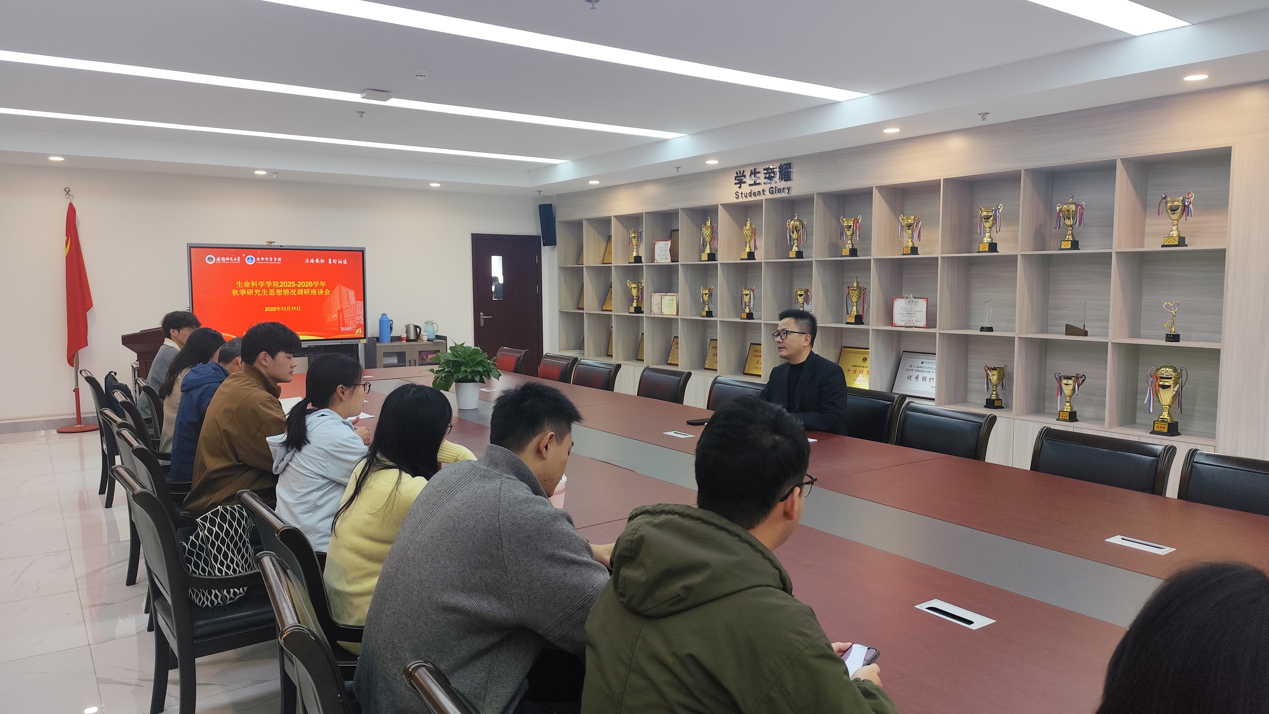 为全面实施大学生护航行动计划,精准把握新学期研究生的思想脉搏与现实诉求,切实解决研究生群体在思想成长、科学研究、日常生活及职业发展等方面面临的实际问题,学院于11月11日组织召开“2025-2026学年秋季研究生思想动态调研座谈会”。学院副院长王鹏、辅导员夏行权、柴文杰、赵航以及各年级研究生代表共同参会,会议由王鹏主持。