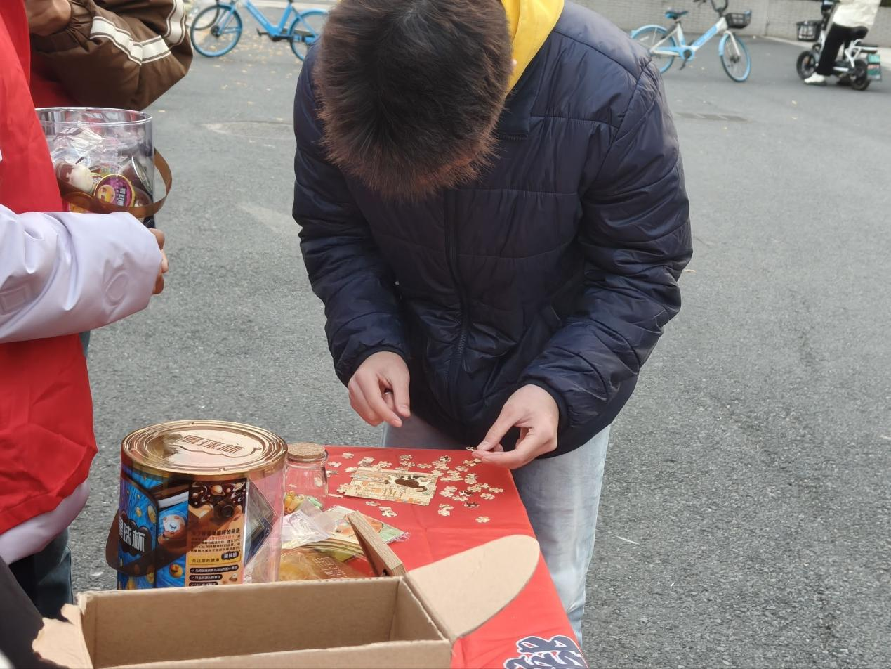 活动现场设置多种参与方式,在“心灵漂流瓶”环节,同学们将自己对志愿服务的理解、收获或寄语认真写在便签条上,装进胶囊,并投入到珍藏瓶中,跃动的文字里藏着温暖的力量与深刻的感悟,让志愿服务的初心随着文字流淌。另有“益智拼图”“趣味绕口令”“诗词断句”“欢乐投沙包”“幸运掷骰子”等多个互动环节,同学们踊跃参与。
