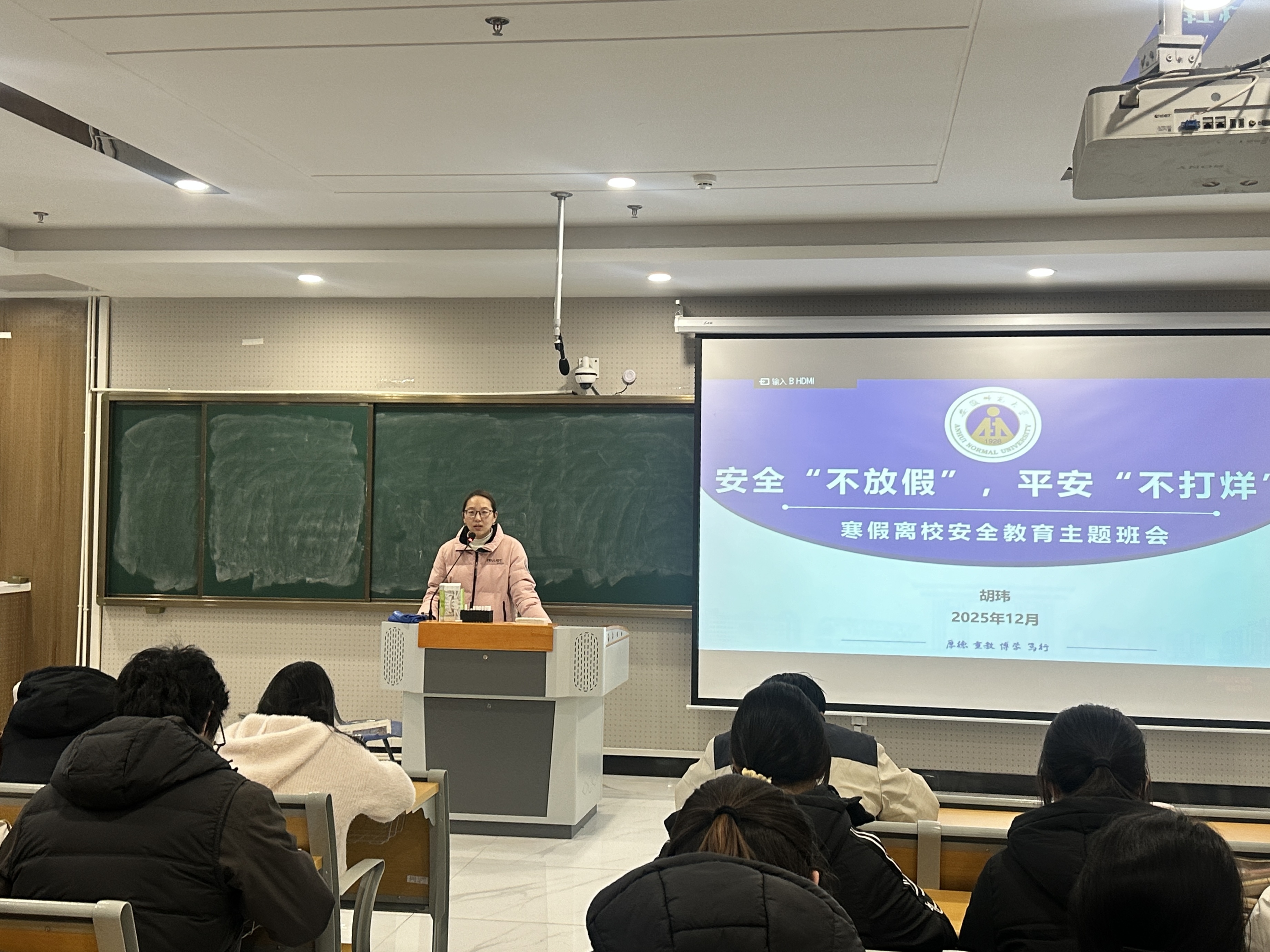 胡玮围绕寒假离校期间的各类安全隐患,从网络安全、消防安全、电诈防范、交通安全、生命安全五个方面展开系统讲解。