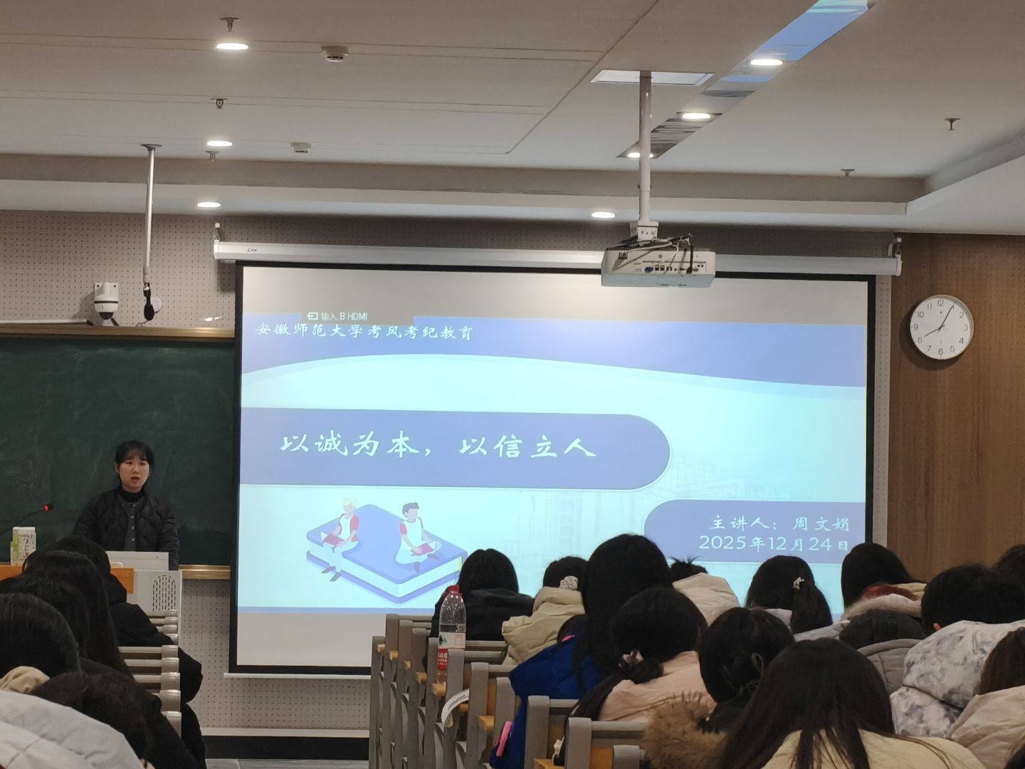 期末将至,为营造公平公正的考试氛围,引导学生树立诚信意识,以良好状态迎接期末考试。12月24日,2025 级食品科学与工程专业、生物科学专业于清源楼c407教室召开考风考纪教育主题班会,班会由辅导员周文娟主讲,全体同学参加。