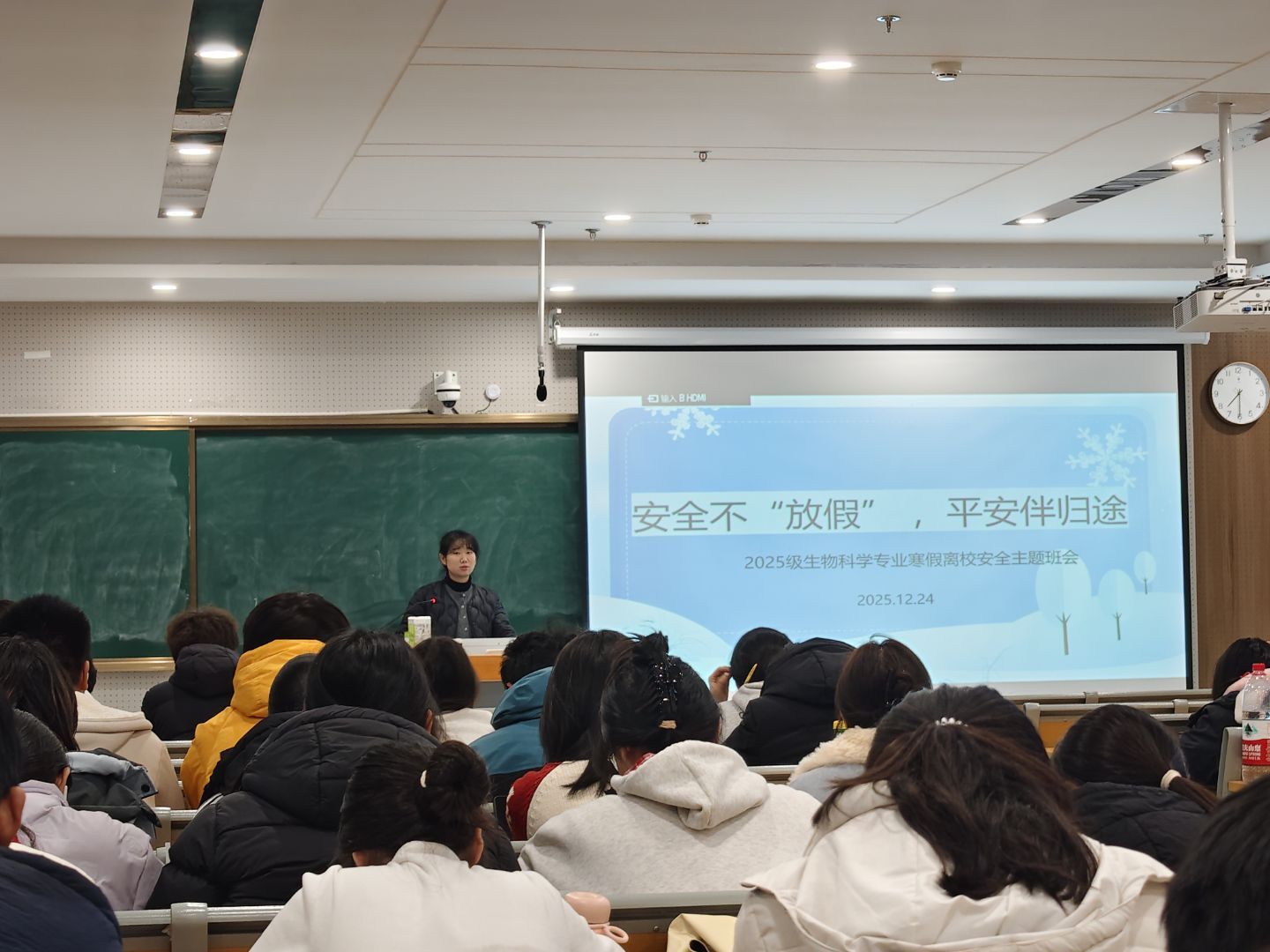 寒假将至,为切实筑牢校园安全防线,增强学生安全意识与自我保护能力,12月24日晚,2025级食品科学与工程、生物科学专业在清源楼c407教室召开寒假离校安全主题班会。辅导员周文娟聚焦网络文明、交通安全、安全离校等内容展开,为学生平安顺利离校,欢度假期保驾护航。