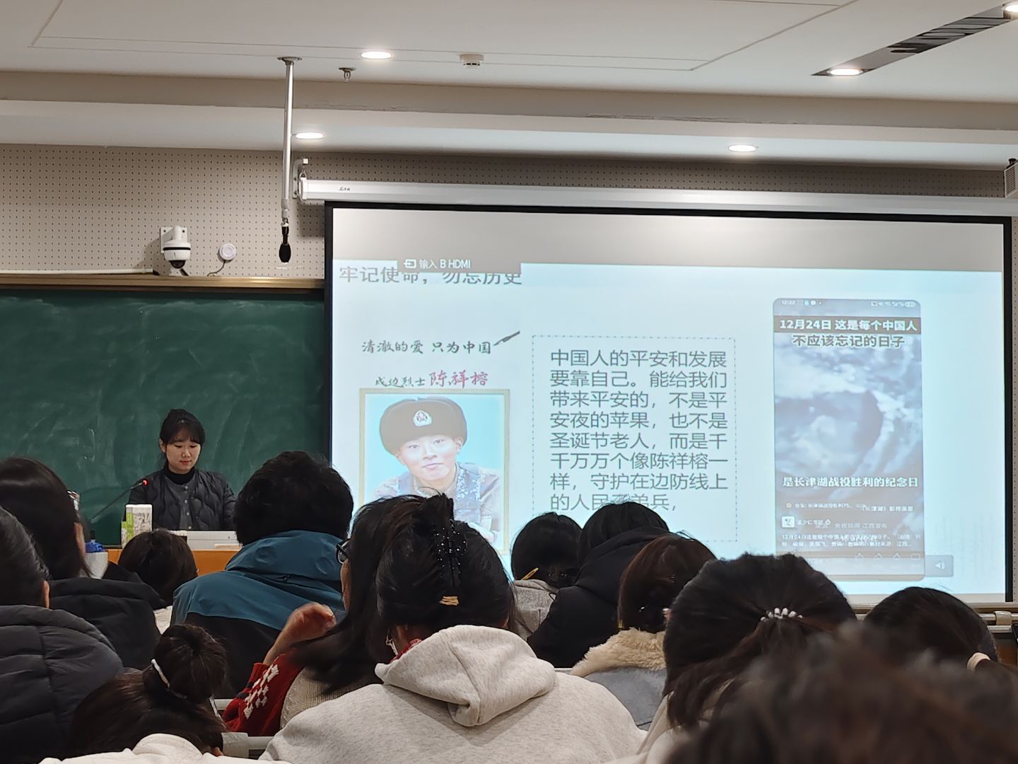 班会伊始,周文娟引用长津湖战役中“冰雕连”的感人故事,以及年轻战士陈祥榕的英勇事迹,呼吁大家勿忘历史、吾辈自强,珍惜大学时光,矢志奋斗。同时,周文娟结合《全国青少年网络文明公约》,强调了文明上网的重要性,提醒同学们自觉抵制网络谣言和有害信息,不利用非法手段访问境外网站,不下载、传播违规内容,远离不良信息,不轻信、不传播未经证实的消息,不沉迷网络游戏,谨防电信网络诈骗,维护清朗网络空间。