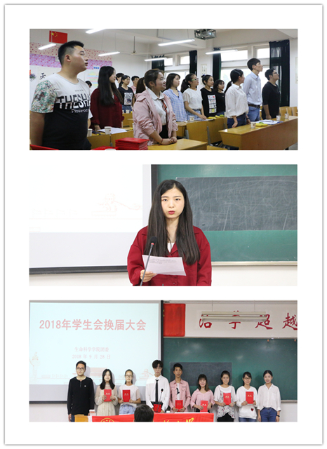本次换届大会在团歌声中拉开序幕。王志老师宣读了2018-2019学年学生会任职名单,勉励新任学生干部要起到“思想引领、榜样带动、促进学风”的作用。随后,新任职学生会主席王阿利同学代表发言,她表示将带领学生会服从育人工作大局,立足学生需求,踏实本职工作,提升团学工作质量。
