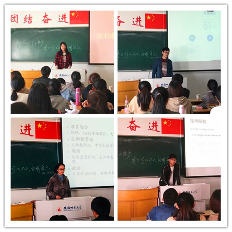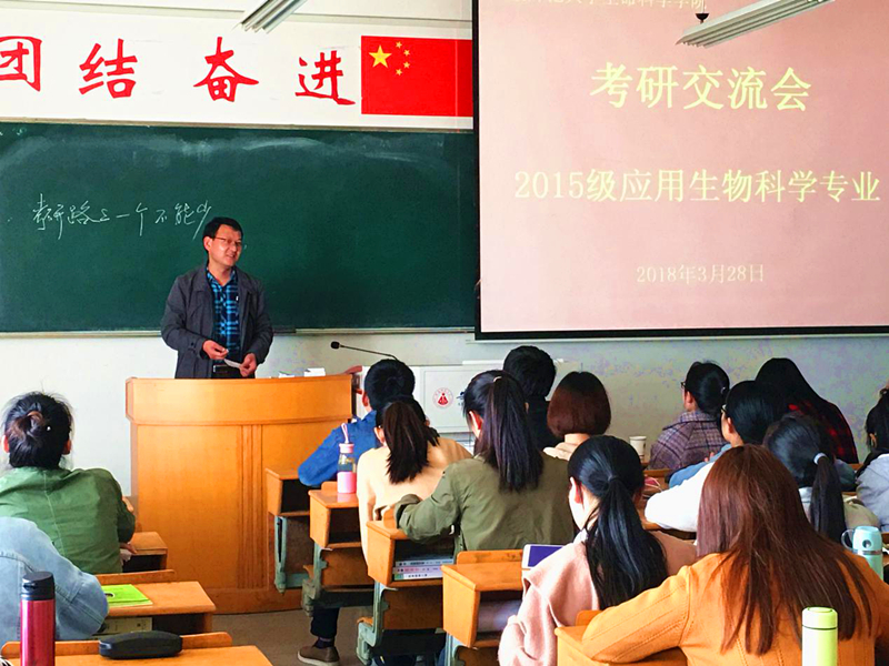 本网讯(生科院 罗平平)为了进一步提高同学们的考研热情,了解更多考研信息,明确目标,掌握技巧。3月28日,2015级应用生物科学专业主办的考研经验交流会在田家炳楼8509教室举行。学院党委副书记刘振杰老师邀请了4位在2018年考研中取得优异成绩的同学与大家交流。