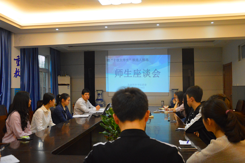 本网讯(生科院 何馗馗) 为更加全面了解“十佳大学生”候选人在校表现,更好选树学生典型,引领生科学子践行社会主义核心价值观、成长成才,4月10日,学院团委组织召开了第14届“师大骄子”十佳大学生候选人推选师生座谈会。学院党委书记蒋学波、团委书记王志、各年级辅导员、学生代表20余名参加座谈。座谈会由院团委副书记何馗馗主持。