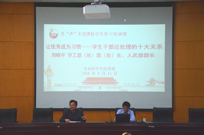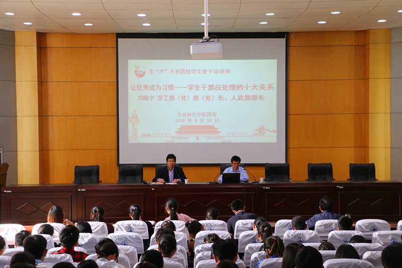 本网讯(生科院 何馗馗) 4月11日,我院生“声”不息团学骨干培训班在田楼报告厅开讲。校学工处处长、学工部部长刘晓宇应邀作题为《让优秀成为习惯——学生干部应处理的十大关系》的辅导报告。学院党委书记蒋学波、副书记刘振杰、院团委书记王志、各年级辅导员、学院团学骨干及新生代表共240余学生一同参加学习。报告会由学院党委书记蒋学波主持。