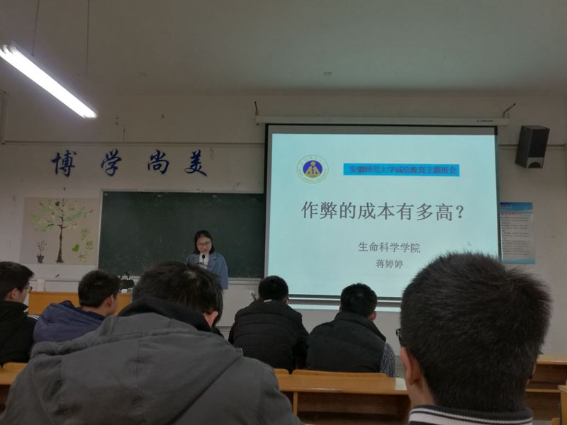 本网讯(17园艺 汪婷玉)期末考试临近,为规范考试过程,提高考试质量,严格考试纪律,树立良好的考风、学风,营造公平、公正的考试环境,生科院2017级各专业于12月27日晚在8408教室召开诚信应考主题教育班会,此次班会由辅导员蒋婷婷主持。