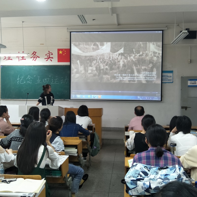 本网讯(房雪) 为纪念“五四”运动100周年,激发同学们的爱国爱党热情,进一步弘扬“爱国、进步、民主、科学”的五四精神,2016级生物制药团支部于4月8日下午在8203教室举行了纪念“五四”运动100周年主题团日活动。学院团委书记、辅导员何馗馗参加,团支部书记徐柯主持活动。
