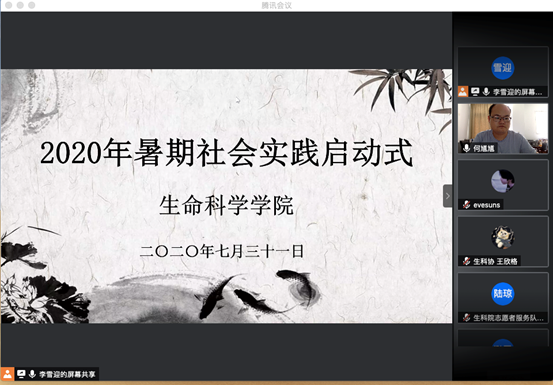 本网讯(生科院 何馗馗)7月31日,生科院举行了2020年大学生暑期“三下乡”社会实践活动线上启动式。2018级全体团支部书记、云端团队负责人、学院团委全体委员参加。会议由学院团委书记何馗馗主持。