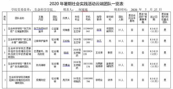 2020年生科院统筹规划、积极动员、严格审核、强化保障,共有328人参加实践。其中,有2支校级重点团队、3支院级重点团队立项,另有274人以个人实践的方式进行暑期社会实践。
