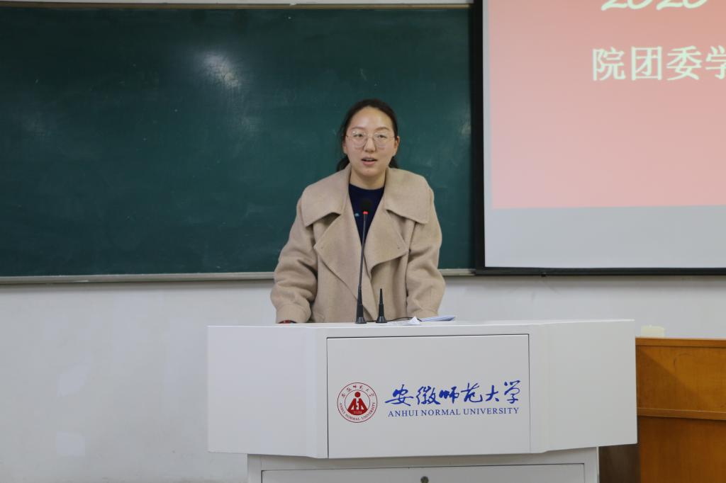 院团委书记胡玮对本次活动进行总结性发言,她首先对各位学生会工作人员的付出给予肯定,感谢同学们上学期在学生工作上的辛勤付出,并指出各学生会工作人员应加强“四史”学习,不断提升自己的道德修养。