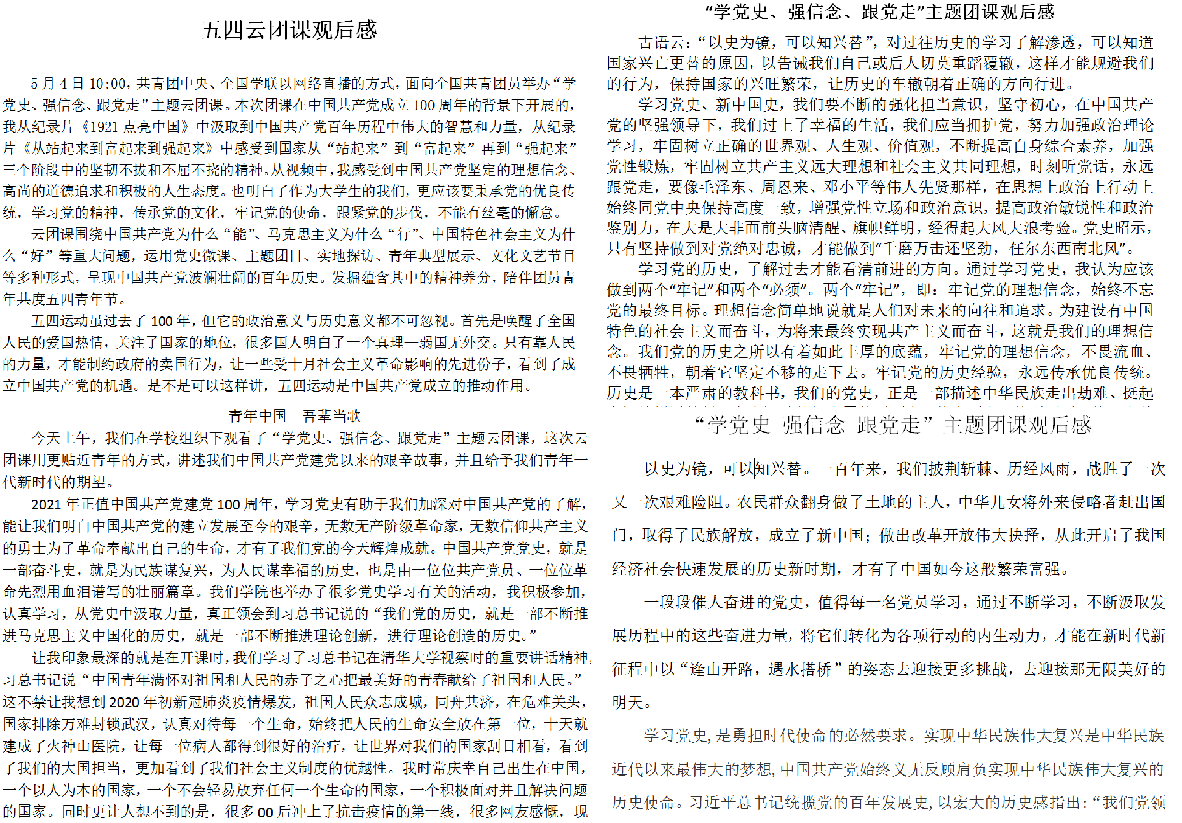 云团课围绕习近平总书记视察清华大学重要讲话精神,围绕中国共产党为什么“能”、马克思主义为什么“行”、中国特色社会主义为什么“好”等重大问题,运用党史微课的形式呈现了中国共产党波澜壮阔的百年历史。发掘蕴含其中的精神养分。学院全体共青团员、团干部积极观看学习了此次云团课,交流了学习心得体会,共同度过了有意义的五四青年节。