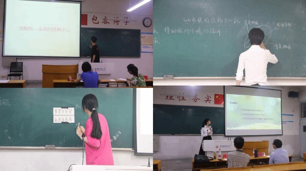 比赛现场,各位选手根据抽签顺序上台授课,限时十分钟。选手们准备较为充分,教学内容基本符合新课标的教学理念,教学整体安排合理,充分展现了19级生物科学一班学子们的风采。评委们充分肯定了本次比赛的内容和形式,对选手们给出了专业而细致的指导与建议。鲁亚平老师指出,生物学教学不光是要传授事实性知识和概念性知识,关键要讲清楚科学的方法。刘再群老师从参加比赛的角度提出要注意细节,需要重视教学设计。谭小娟老师建议上课过程中要多与学生进行眼神交流,PPT要抓重点。王宝娟老师指出在板书上要有设计有目的,要突显出重点与难点。