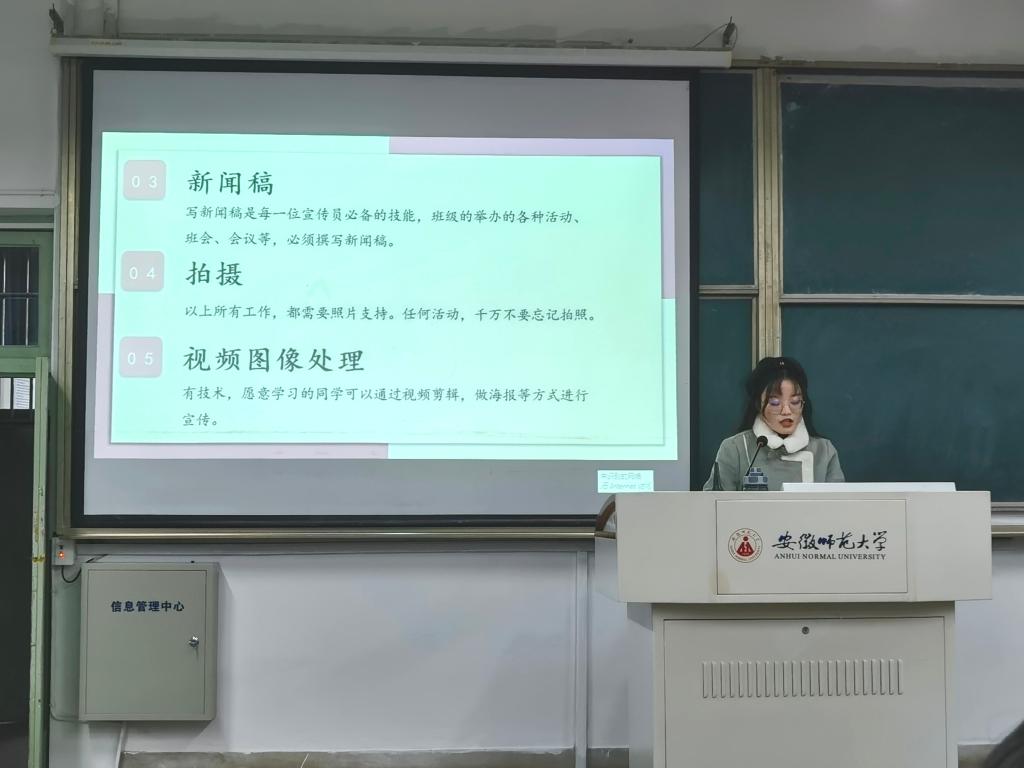 最后,生科院团委各部门进行职责介绍。生科院团委由办公室、组织部、宣传部、素质拓展部组成,各部门各司其职,有条不紊开展工作。同时,部门负责人表示,各班组织委员、宣传委员、素拓委员应与对应部门保持联系,及时了解工作要求和活动安排。其中,宣传委员曾玥琪着重讲解了各班宣委的工作职责以及新闻稿和拍摄照片的要求,让各班宣委对工作有了明确的认识。
